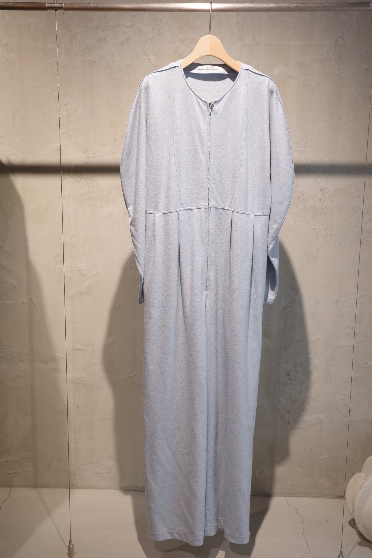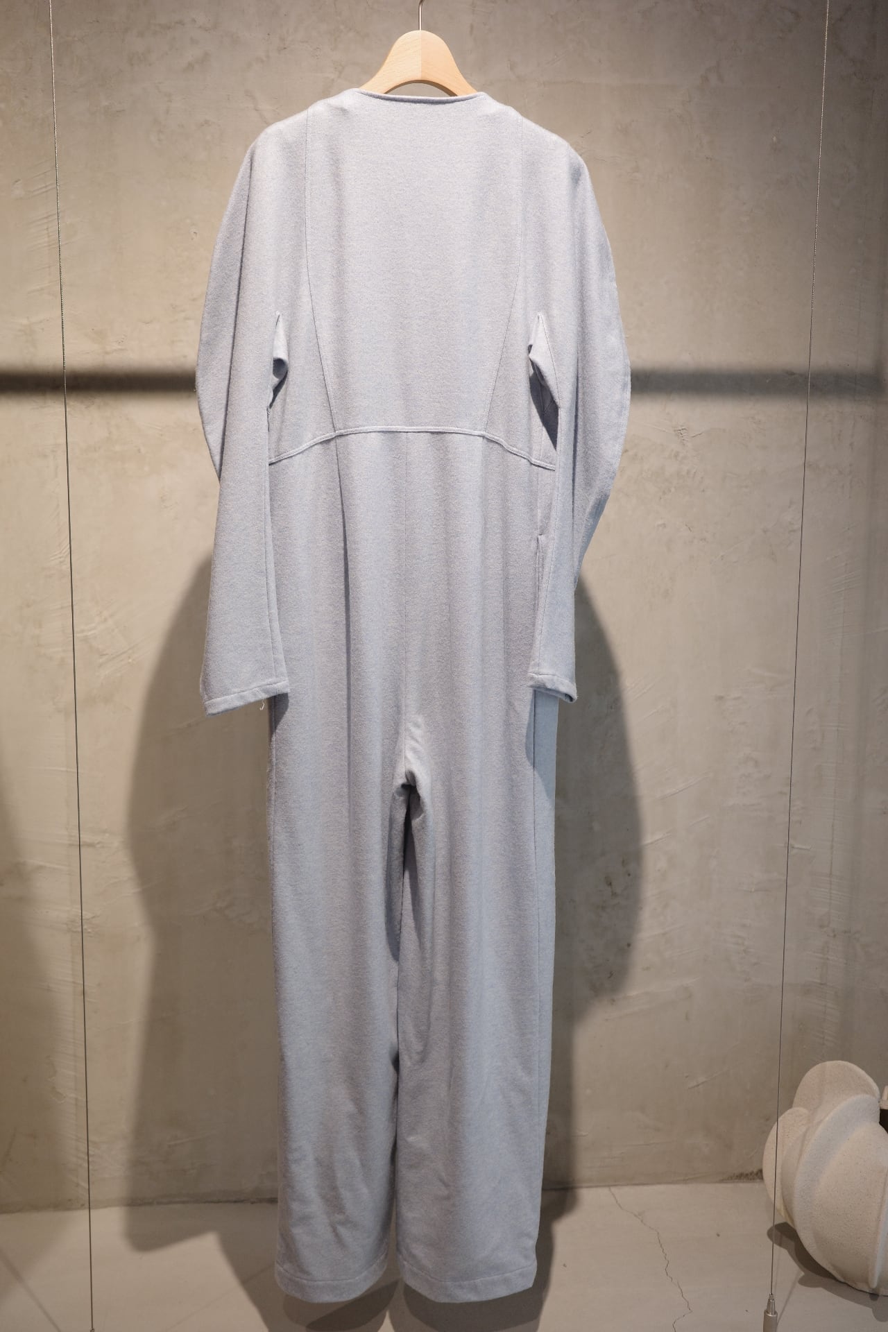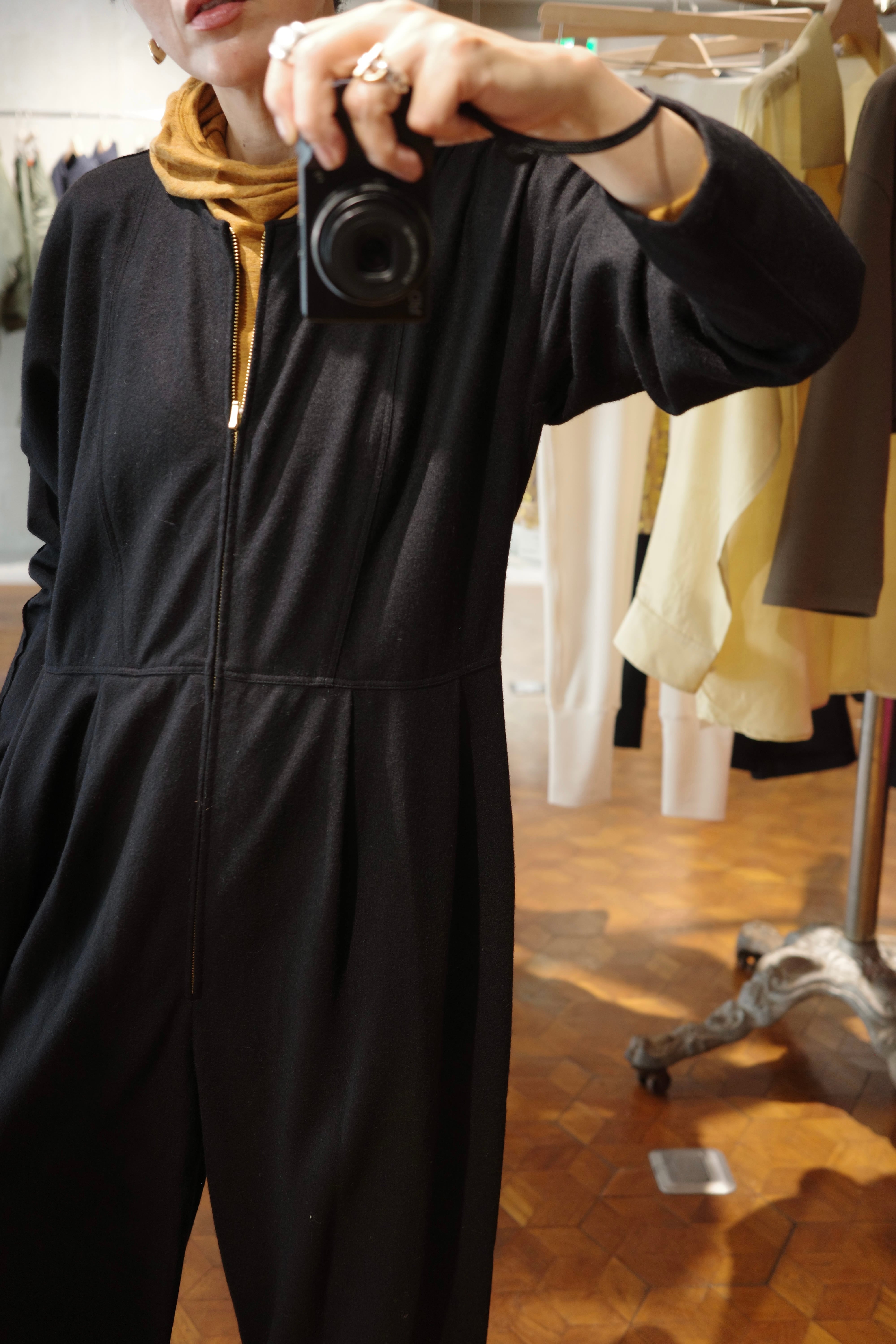 切り替えとダーツが入っていてシンプルながらも特徴のあるシルエットのジャンプスーツです。 腕の部分にも丸みがあり、ちょっとパフスリーブぽくもみえます。 中にカラーを重ねてもらっても印象が,変わります。シンプルながらも使えるジャンプスーツです。 color paleblue,black size free Material wool 80%、nylon 16%、other4% Linning cupra 100%
