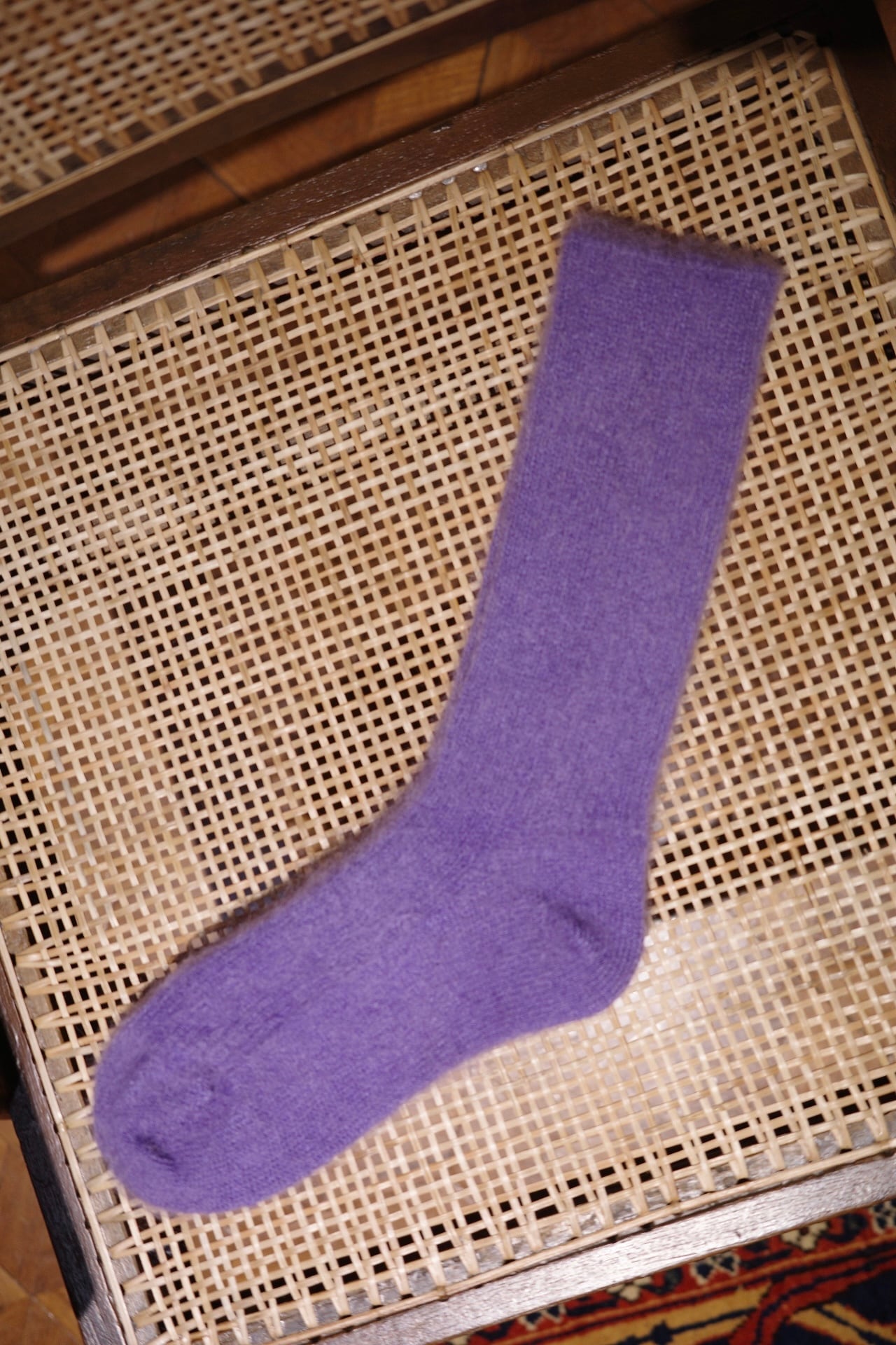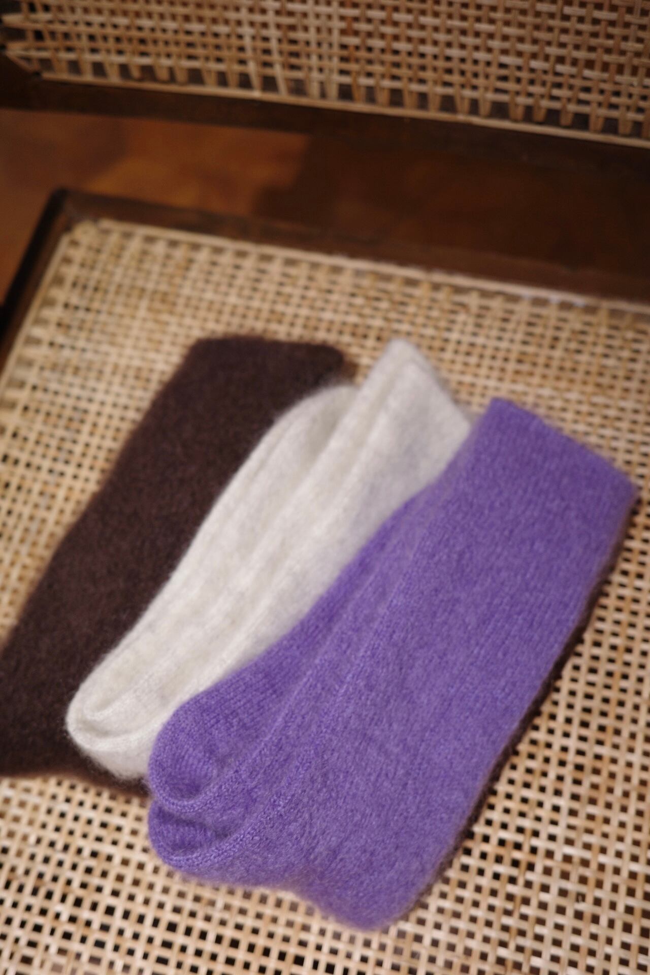 細リブでフィット感のあるモヘアソックスです。フリーサイズ 23-25cm color melange,lavender,cacao size free Material モヘア、ナイロン、ウール、ポリエステル、ポリウレタン
