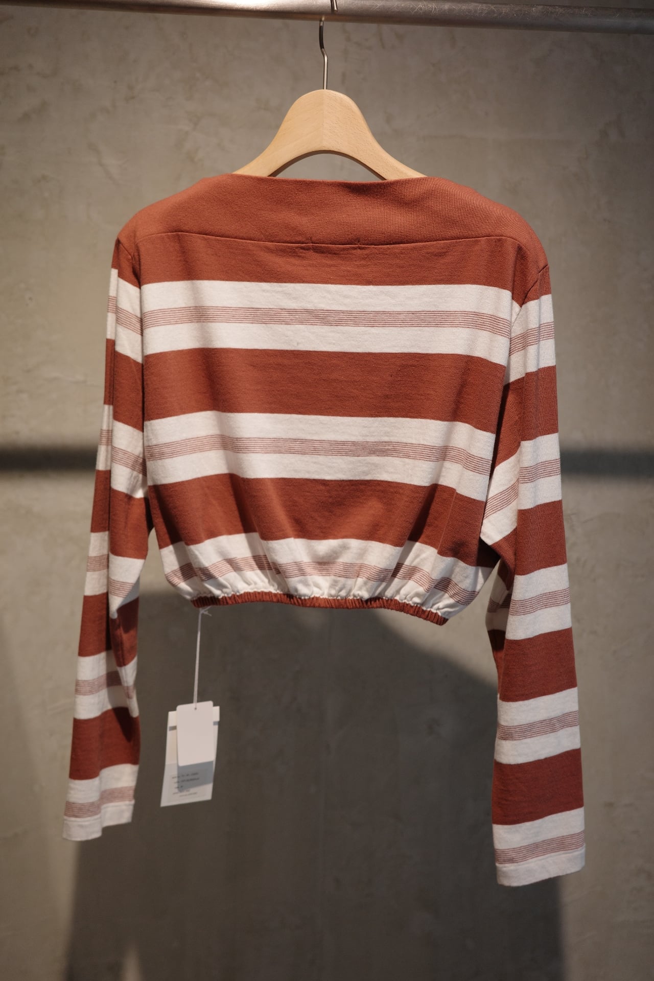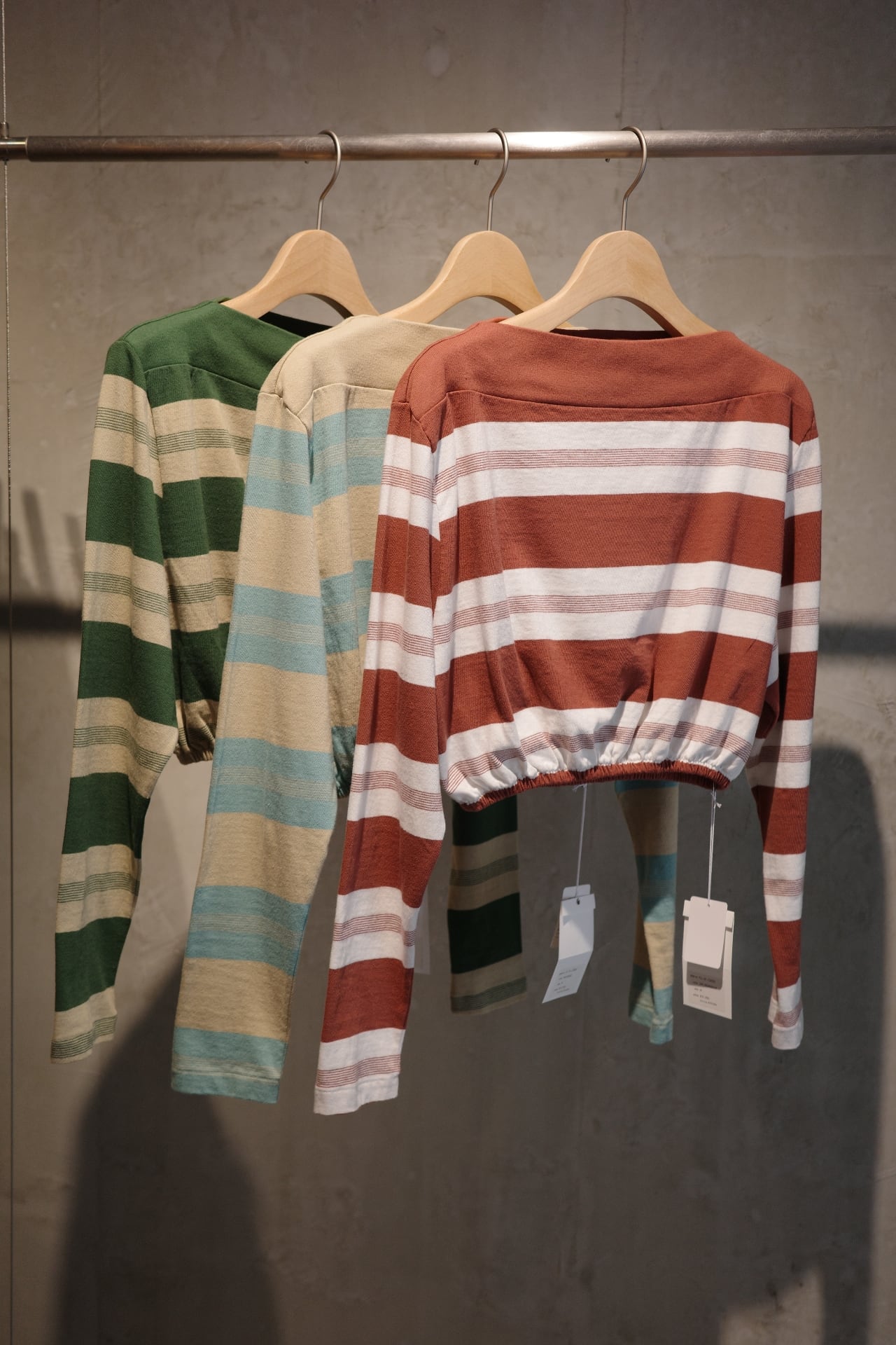 color SAX/BEIGE,OFF/BORDEAUX, BEIGE/GREEN size S,M Quality コットン100% ヴィンテージライクな粗野さのあるコットン糸を使用したオリジナルのボーダー柄生地で作るクロップド丈のロングスリーブTシャツ。 リブ素材をワイルドに切り替えた立体感のあるボートネックです。 カラー、写真3枚目 左より→GREEN,SAX,BORDEAUX