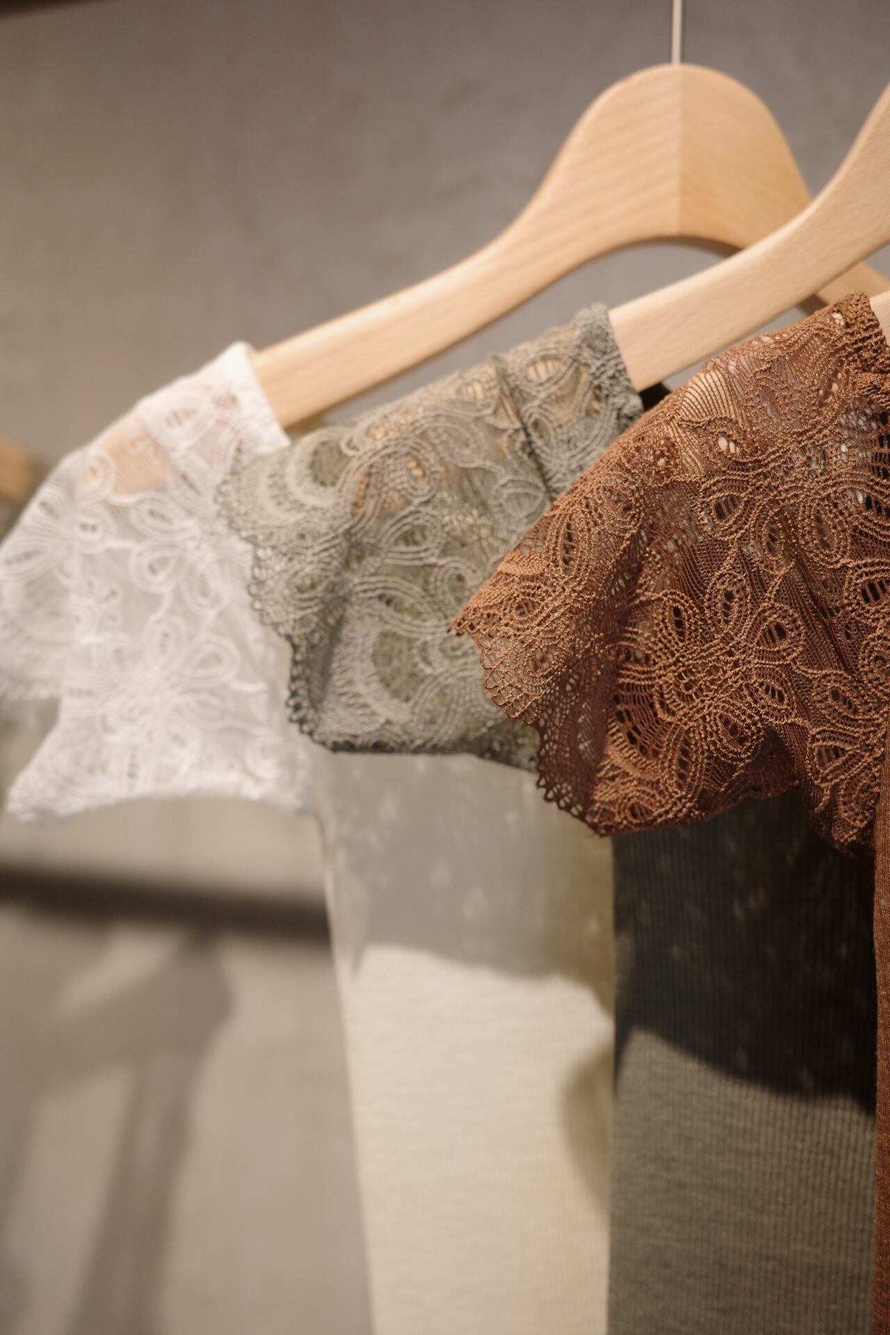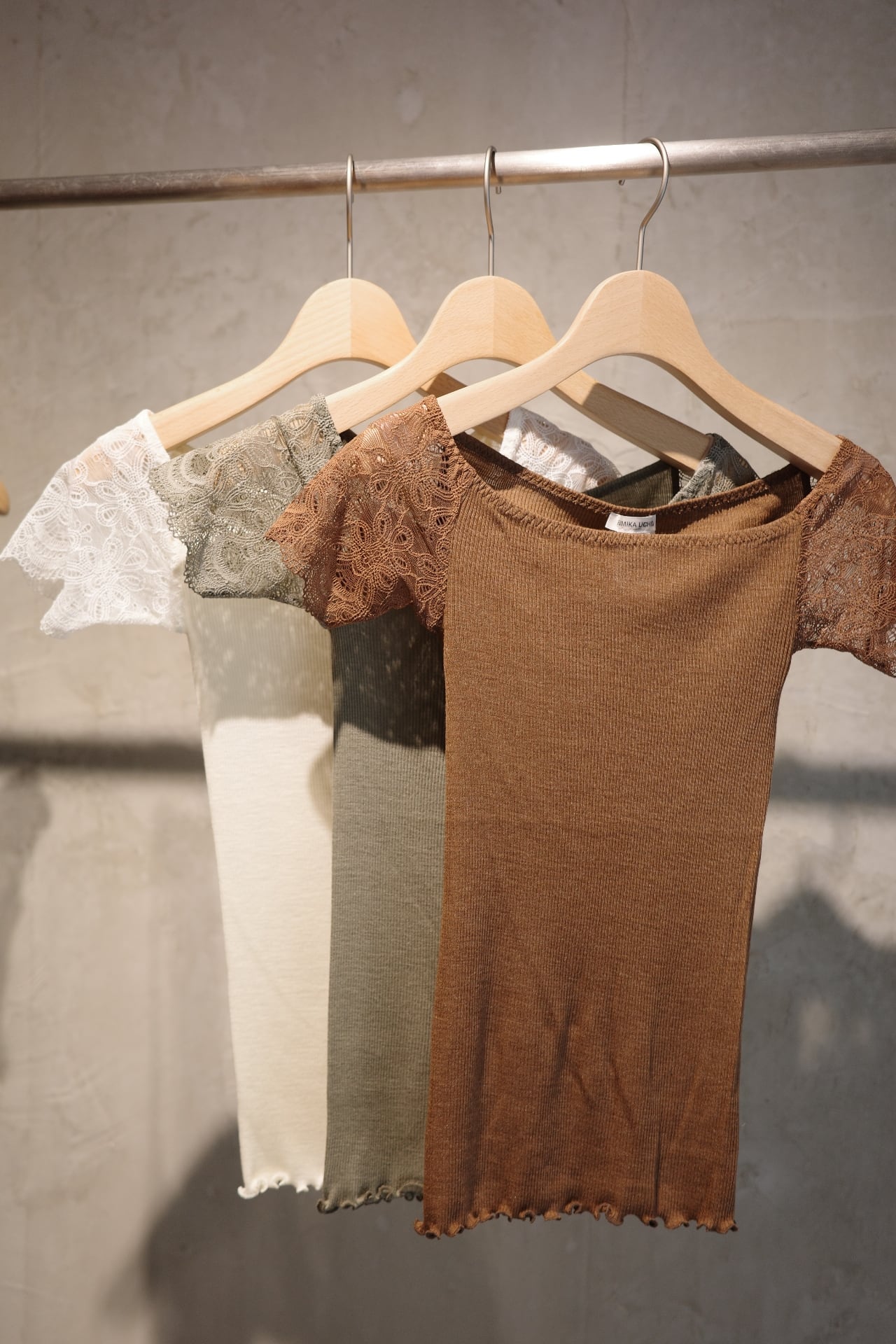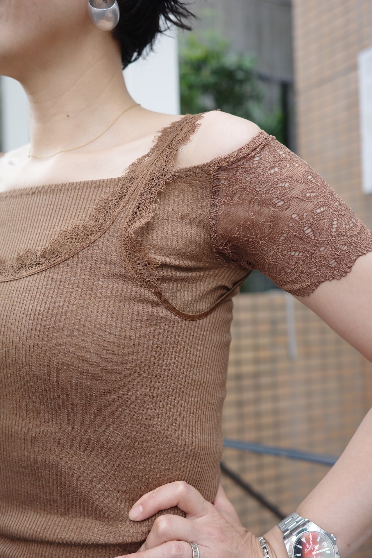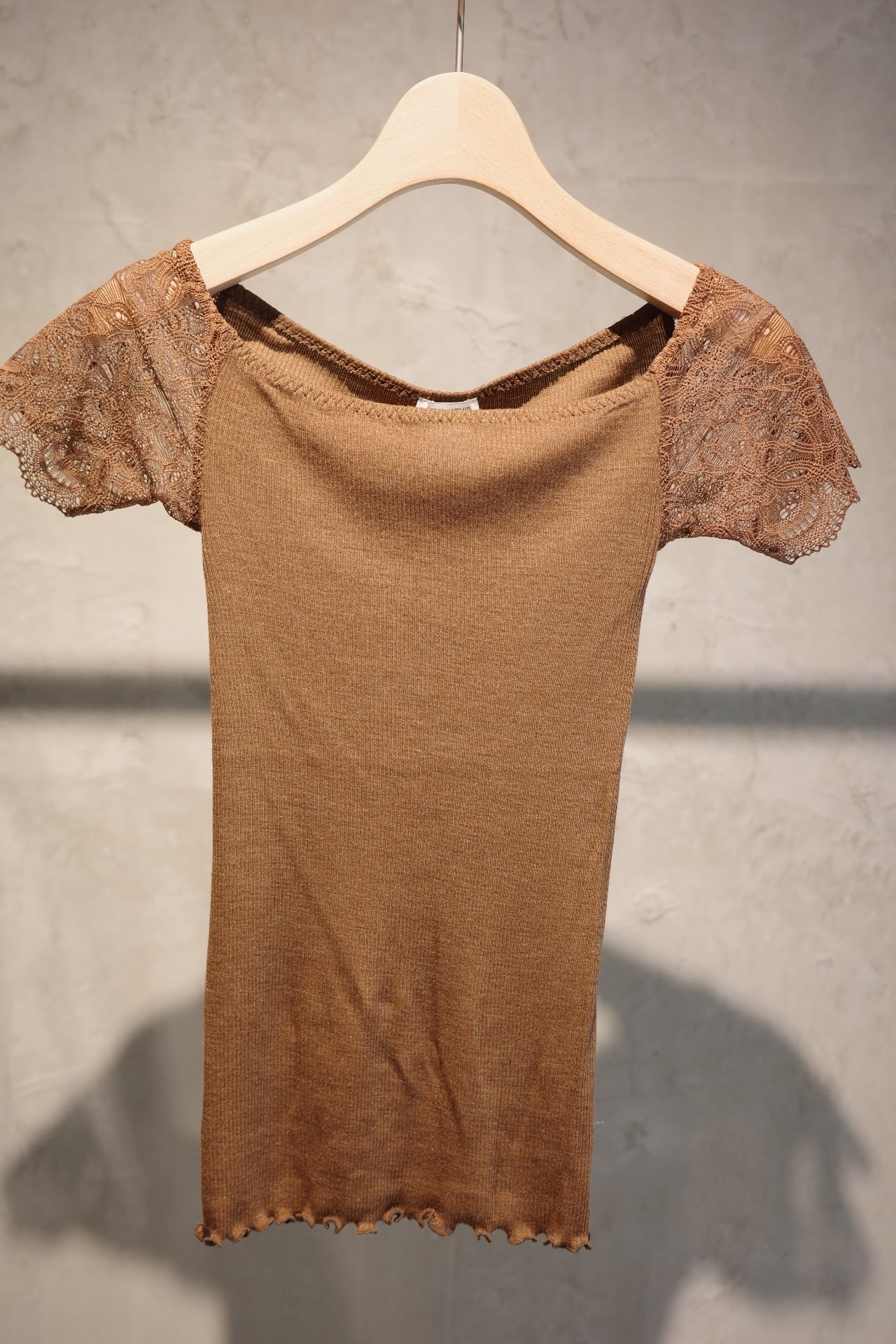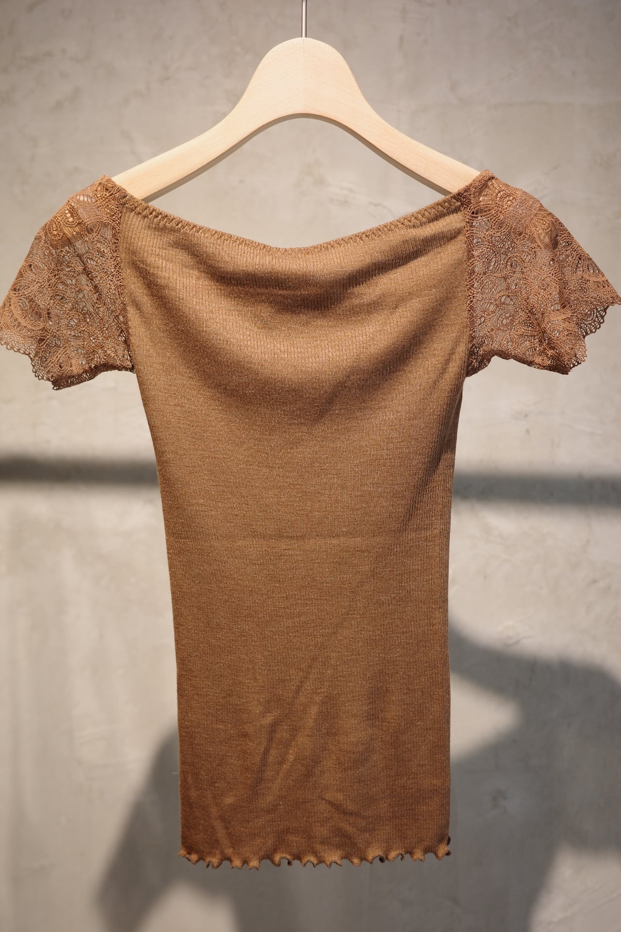 Size ONE SIZE color KINARI, SAGE,BROWN Quality body→ウール80% シルク20% lace→ナイロン88% ポリウレタン12% 日本製 保湿性とフィット感に優れた防縮ウールシルクのアンダーウェア。袖に肌あたりの良いコットンベースのストレッチレースを使用したオフショルダートップインナーです。 同シリーズのキャミソールとの重ね着もお勧めです。