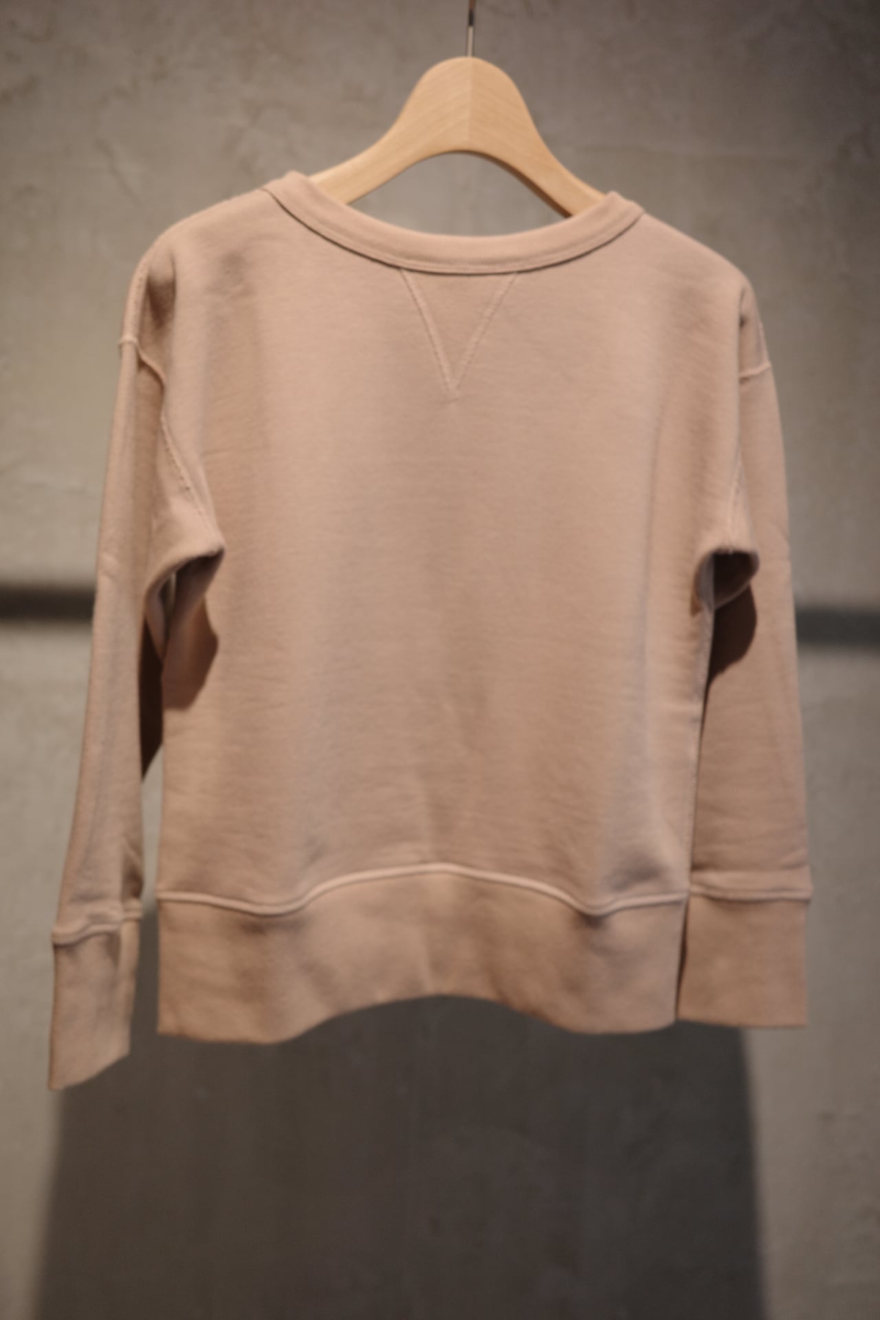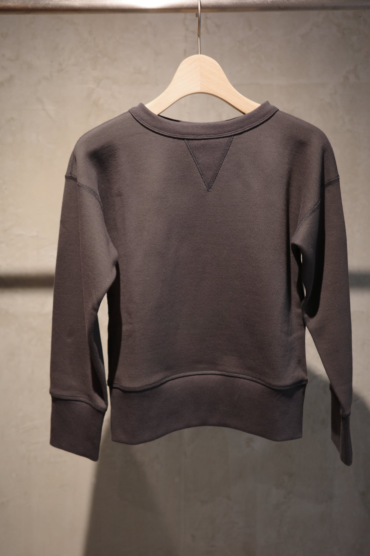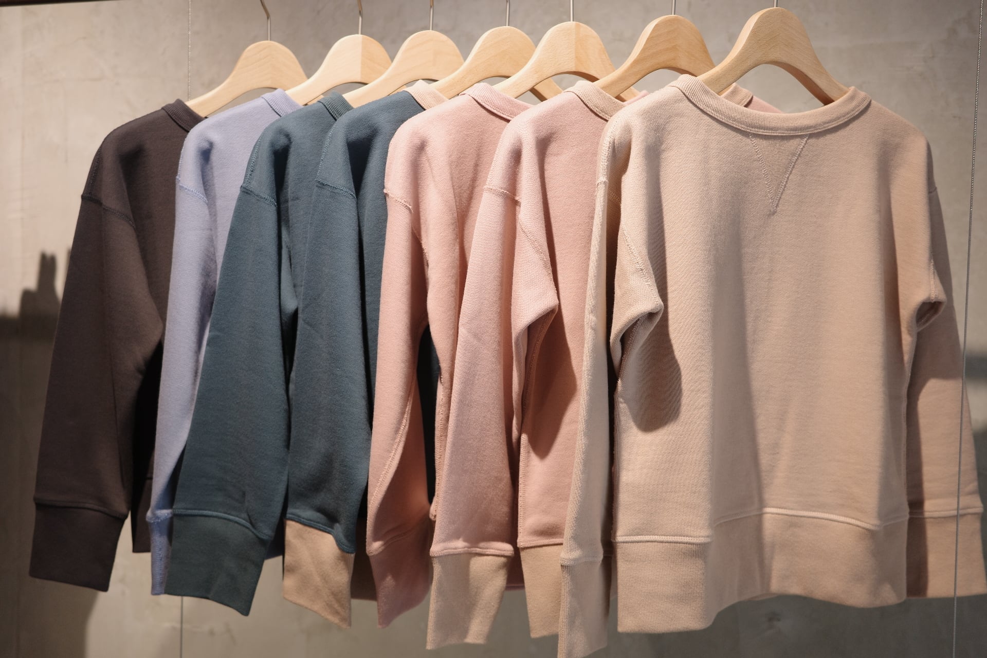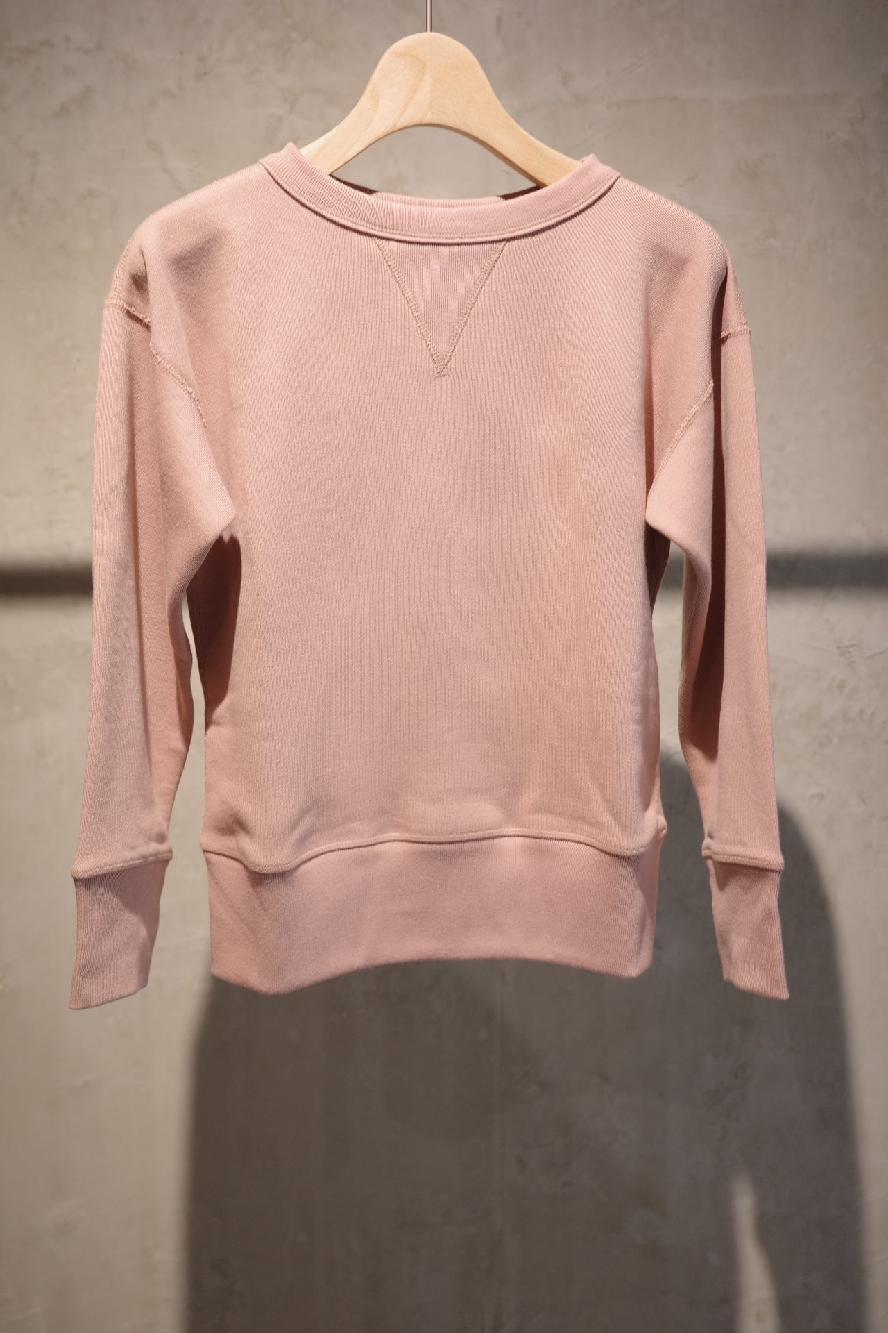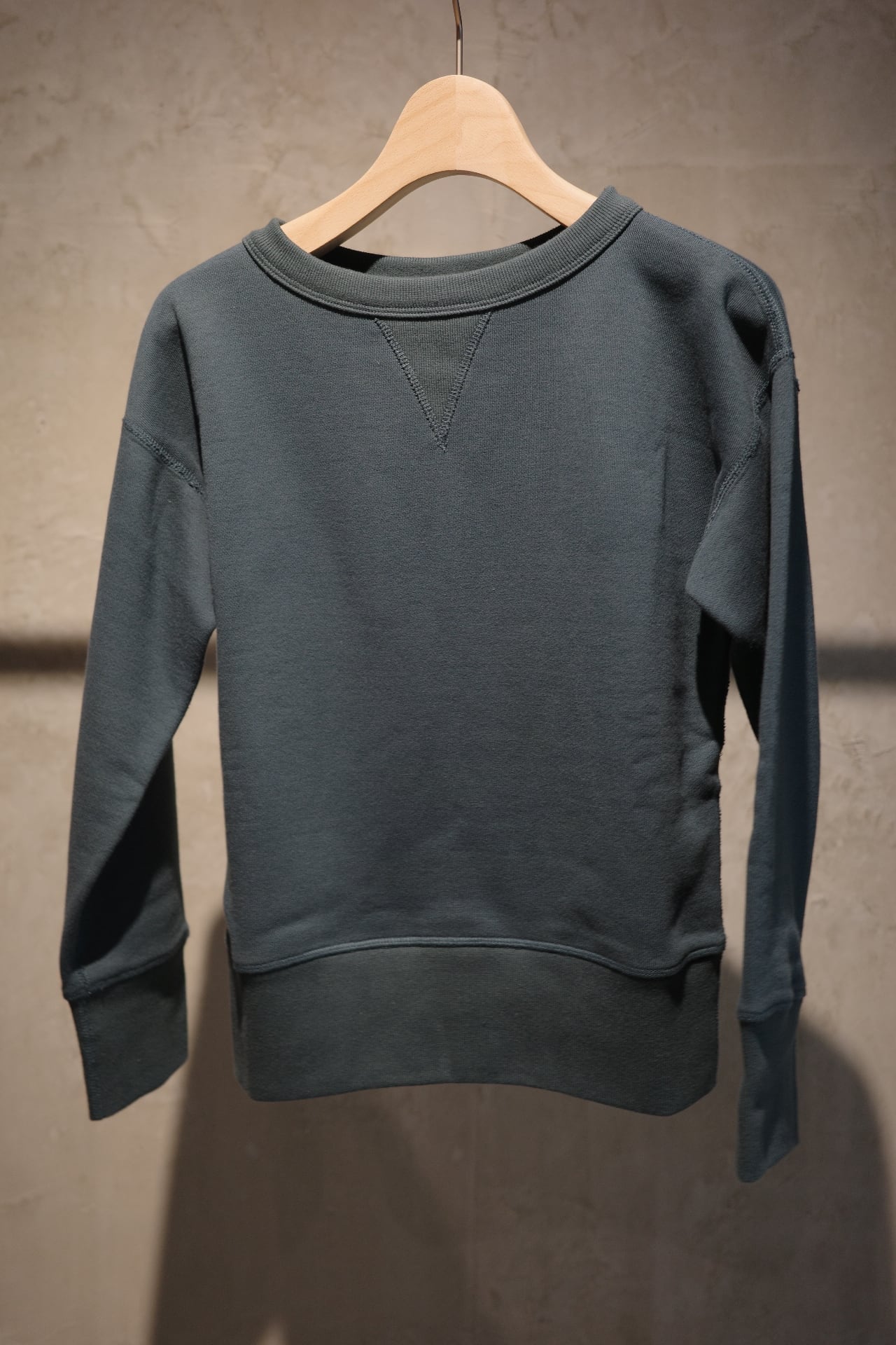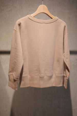 ⽣地には、 1970 年代初期の希少な旧式編み機から⽣まれる、 柔らかくて⾁厚な裏⽑を使⽤。 1 ⽇に 1〜2 反しか編むことができず、 ⽣産量より⾵合いに重きをおいて作られる愛すべき⽣地です。