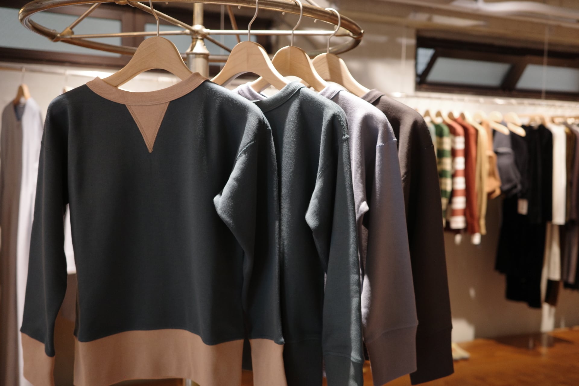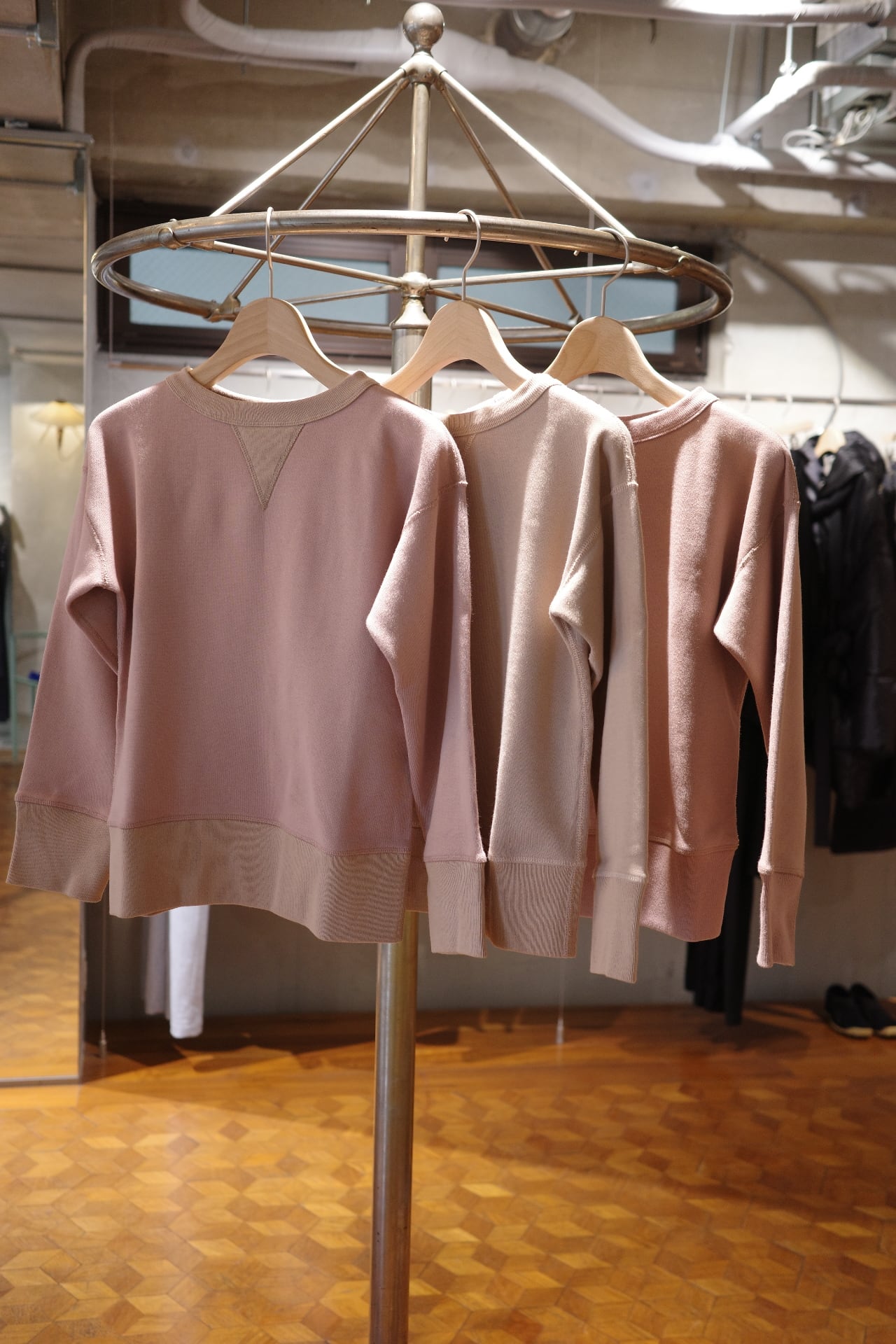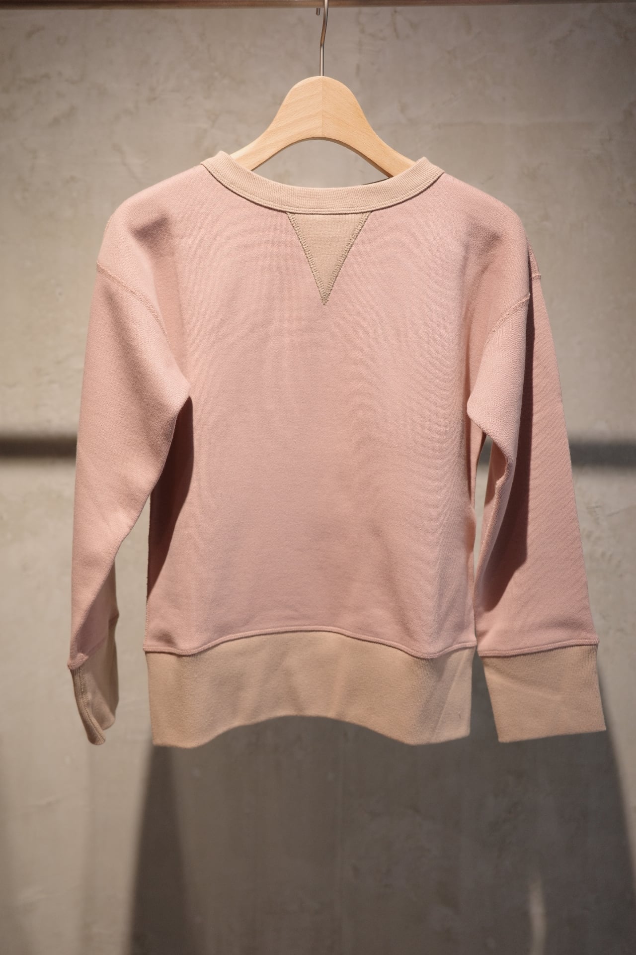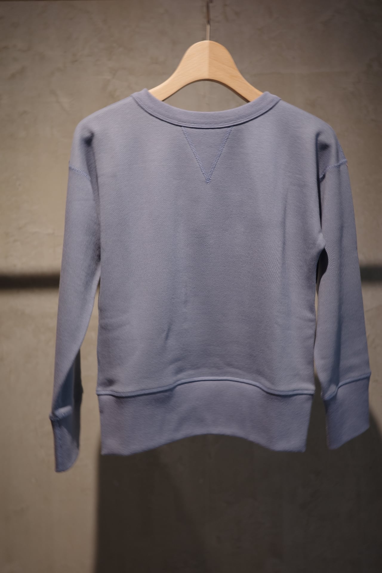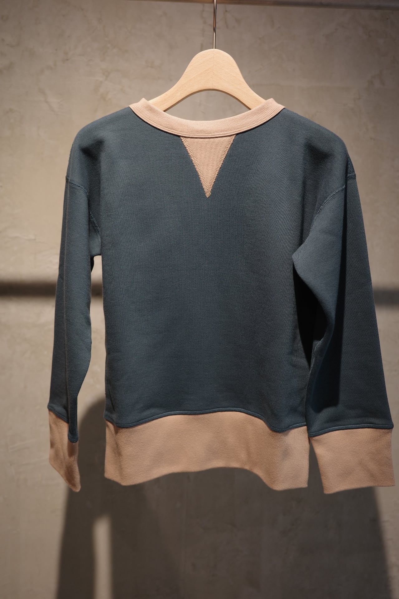 ⽣地には、 1970 年代初期の希少な旧式編み機から⽣まれる、 柔らかくて⾁厚な裏⽑を使⽤。 1 ⽇に 1〜2 反しか編むことができず、 ⽣産量より⾵合いに重きをおいて作られる愛すべき⽣地です。