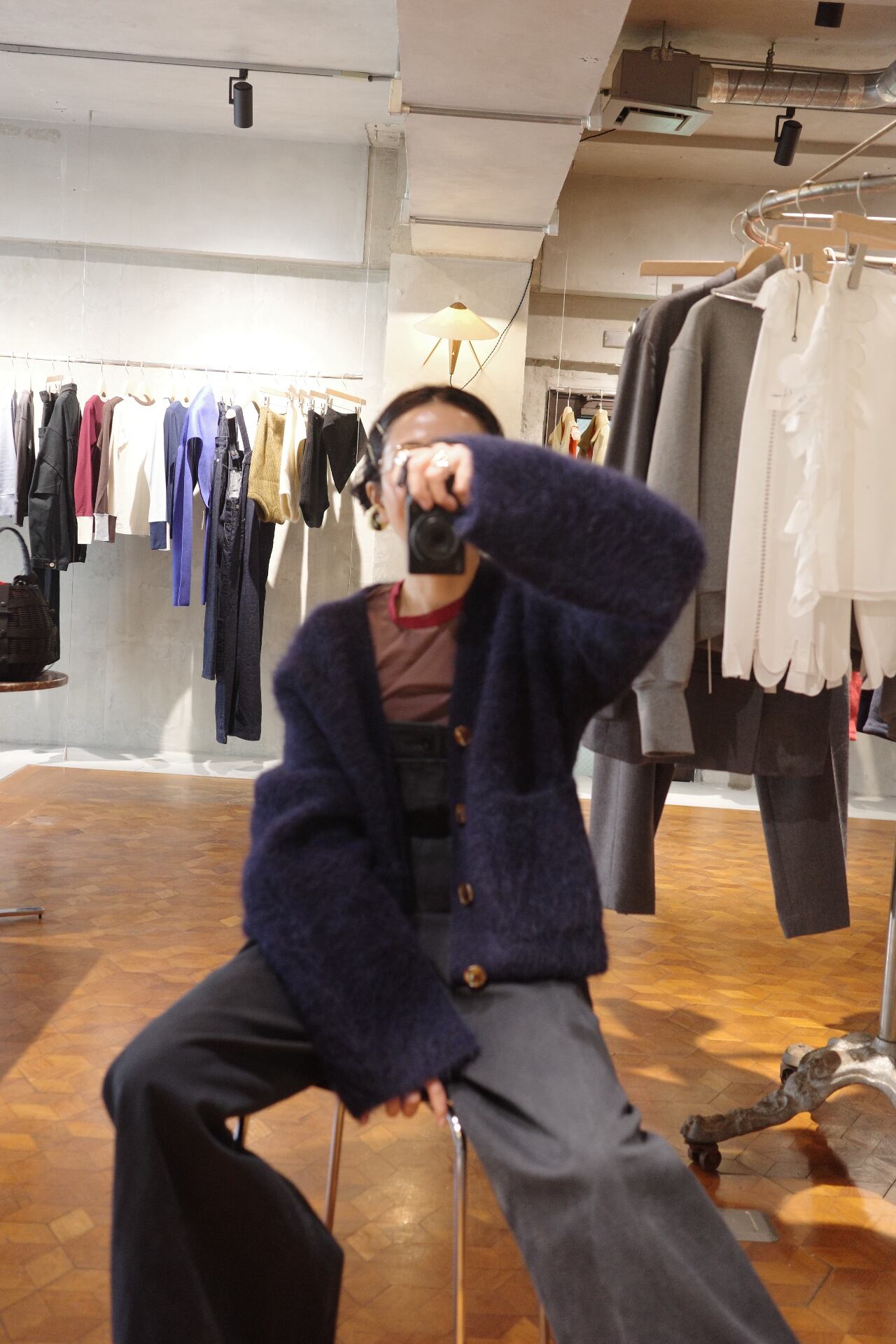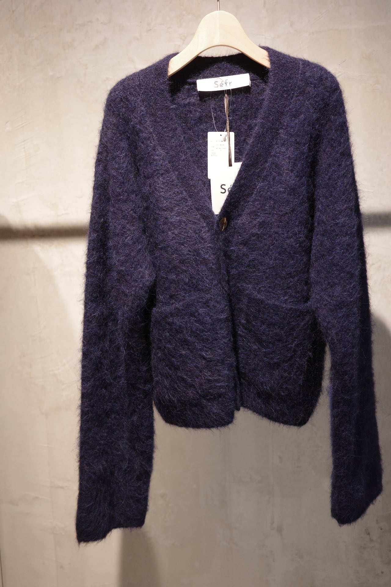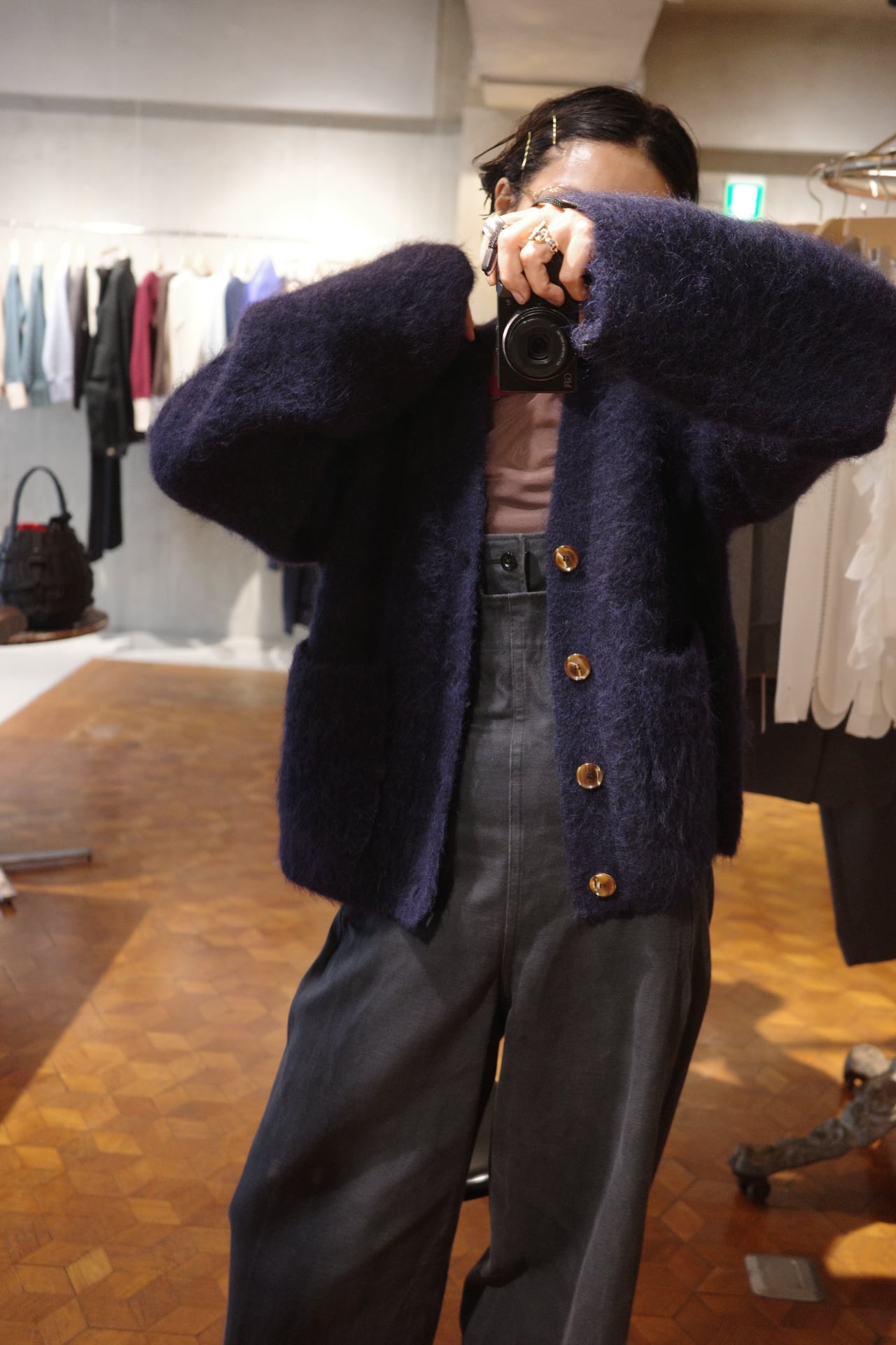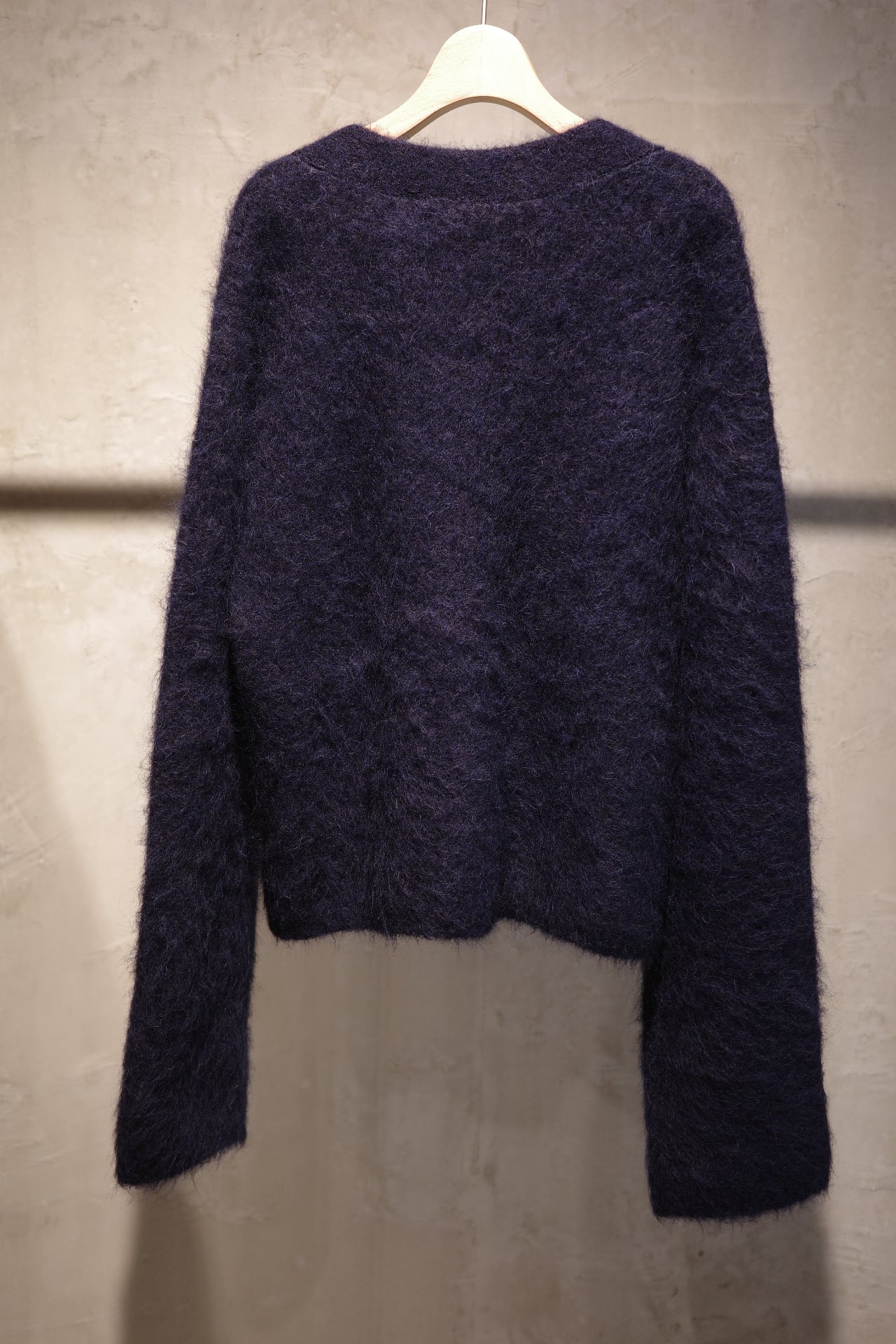 size/S color/ NEPTUNE ALPACA quality/アルパカ78%、ナイロン19%、ポリウレタン3% size/着丈58、身幅、袖丈68、肩幅54.5 オーバーサイズなモヘアのニットカーディガンです。着丈はすっきり 袖が広がったデザイン感で、着ていただくとさりげなく可愛いです。 袖丈は折って頂いても自然にすっきり着ていただけます。