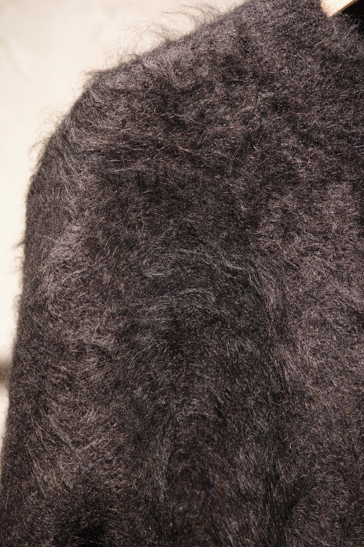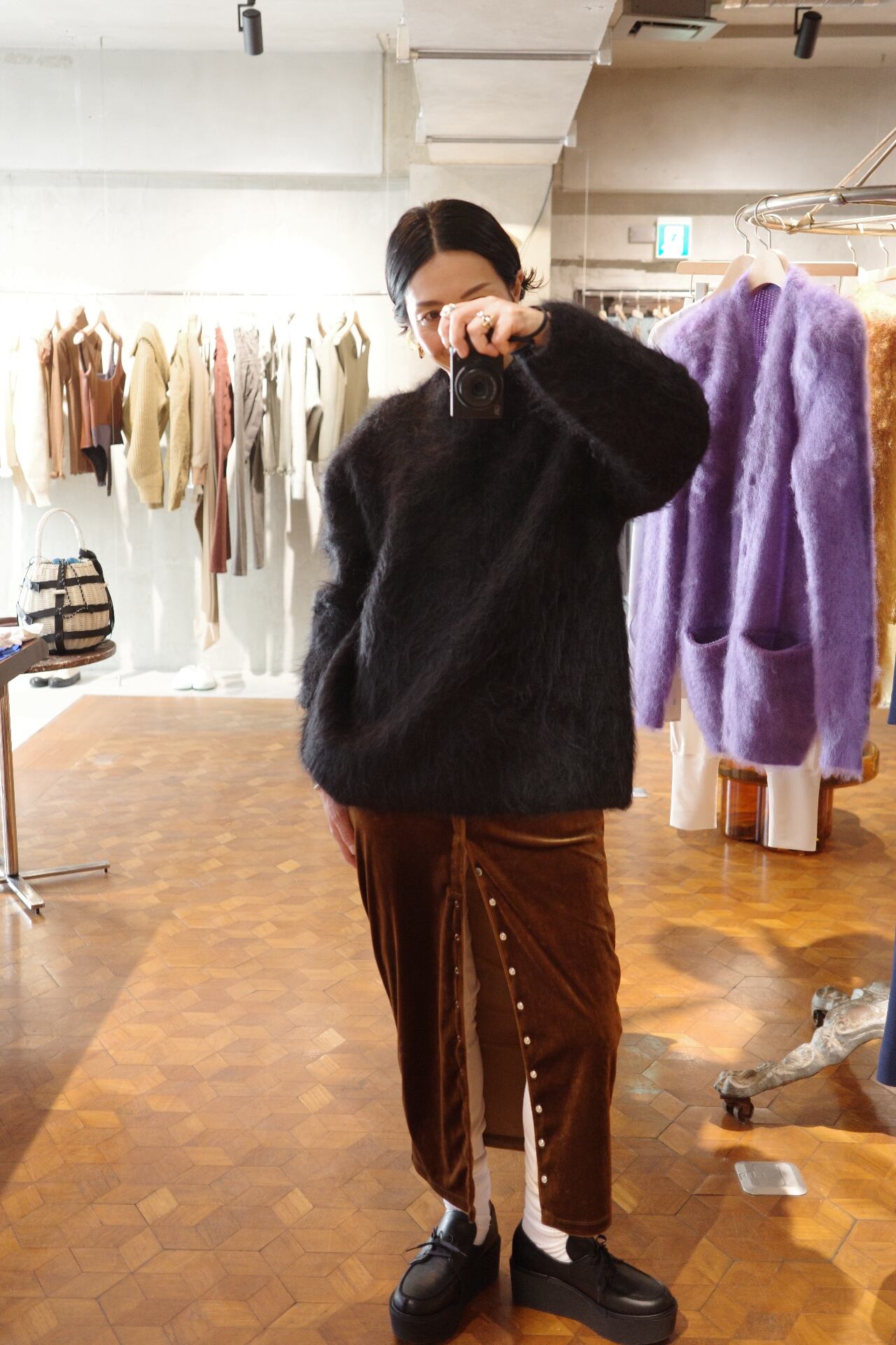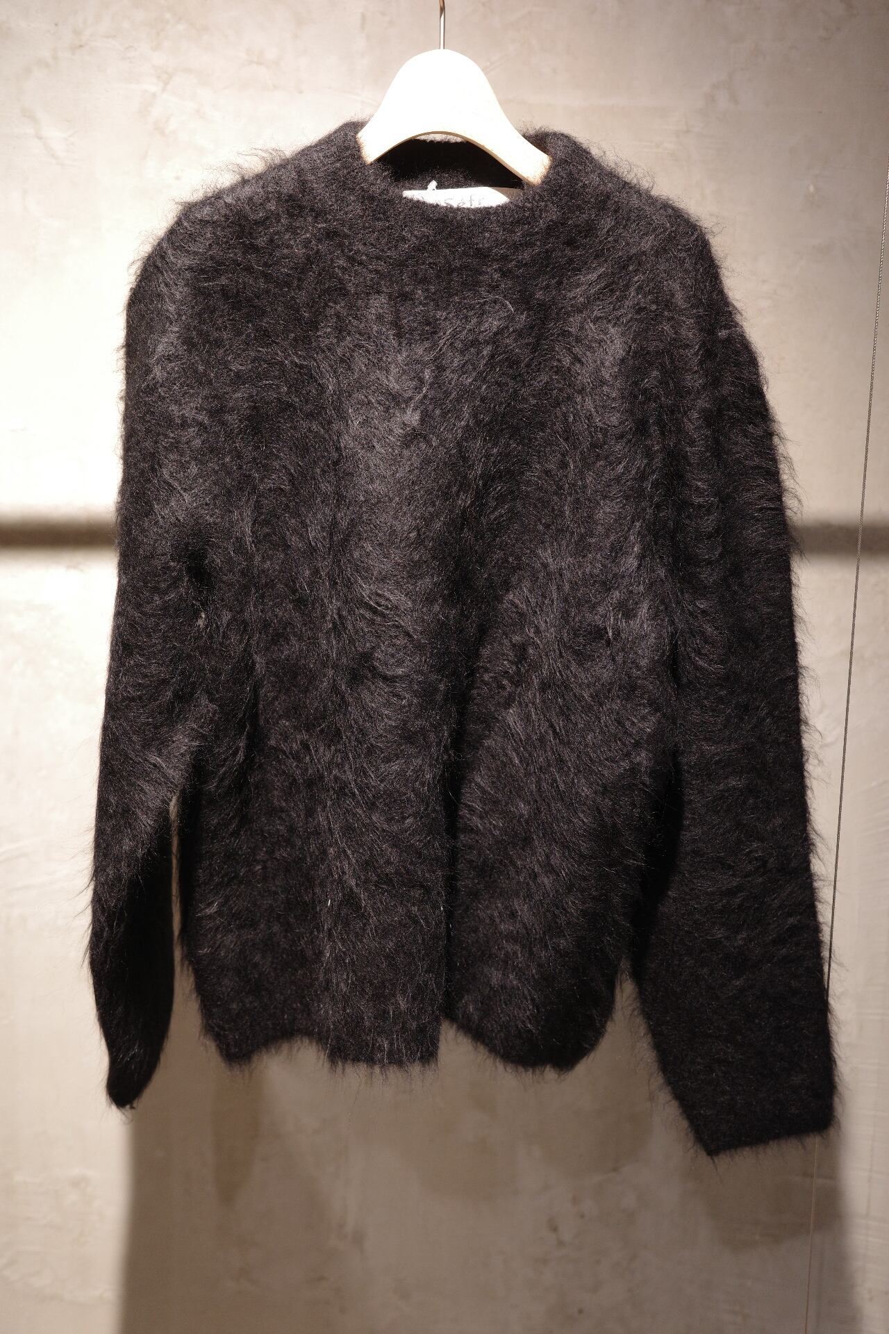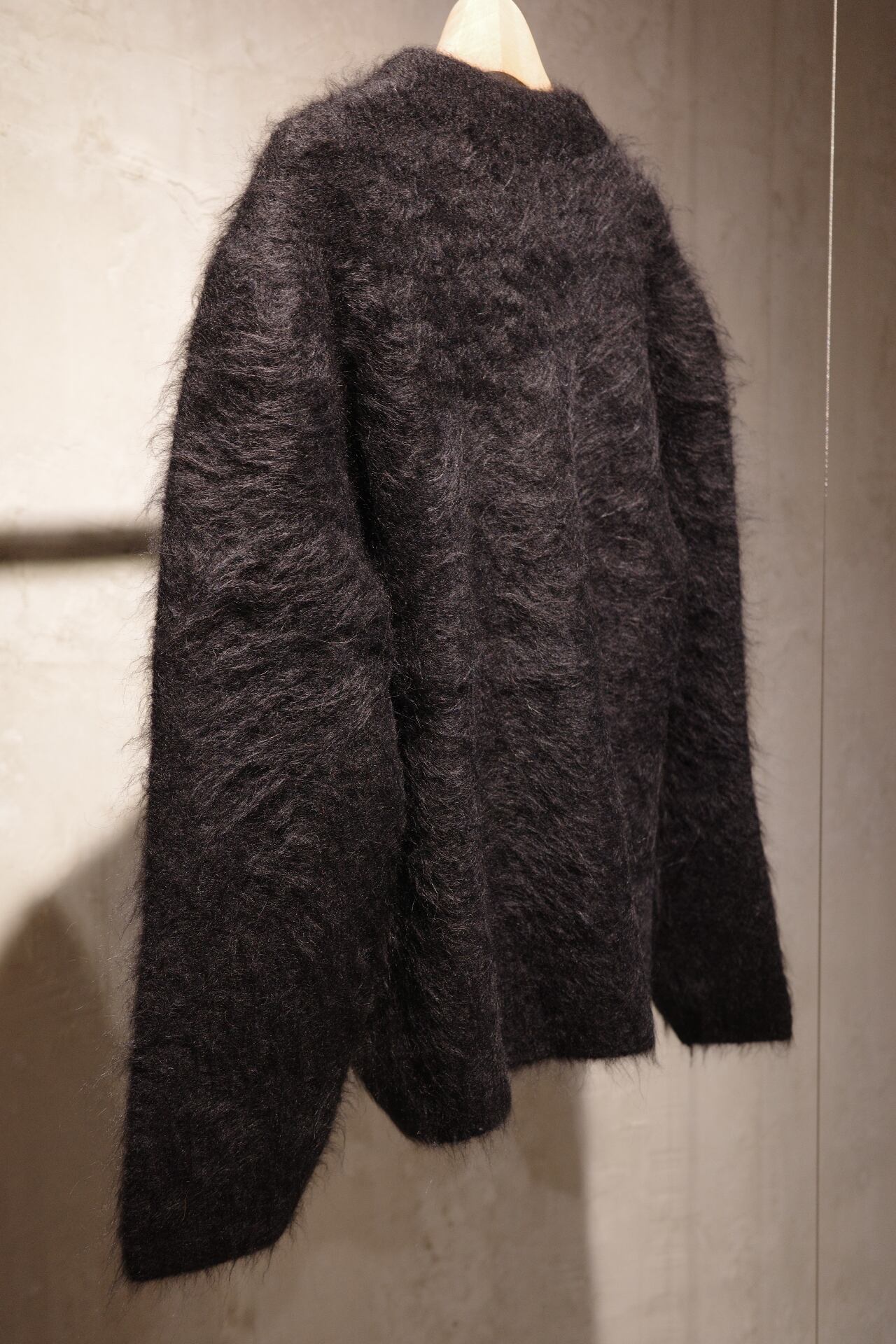 size S color black quality アルパカ78%、ナイロン19%、 ポリウレタン3% size/着丈67.5,身幅58.0,袖丈62.0 モヘアの毛足も長めなニットです。 オーバーサイズに着ていただけ、暖かいです。 万能なニットです。
