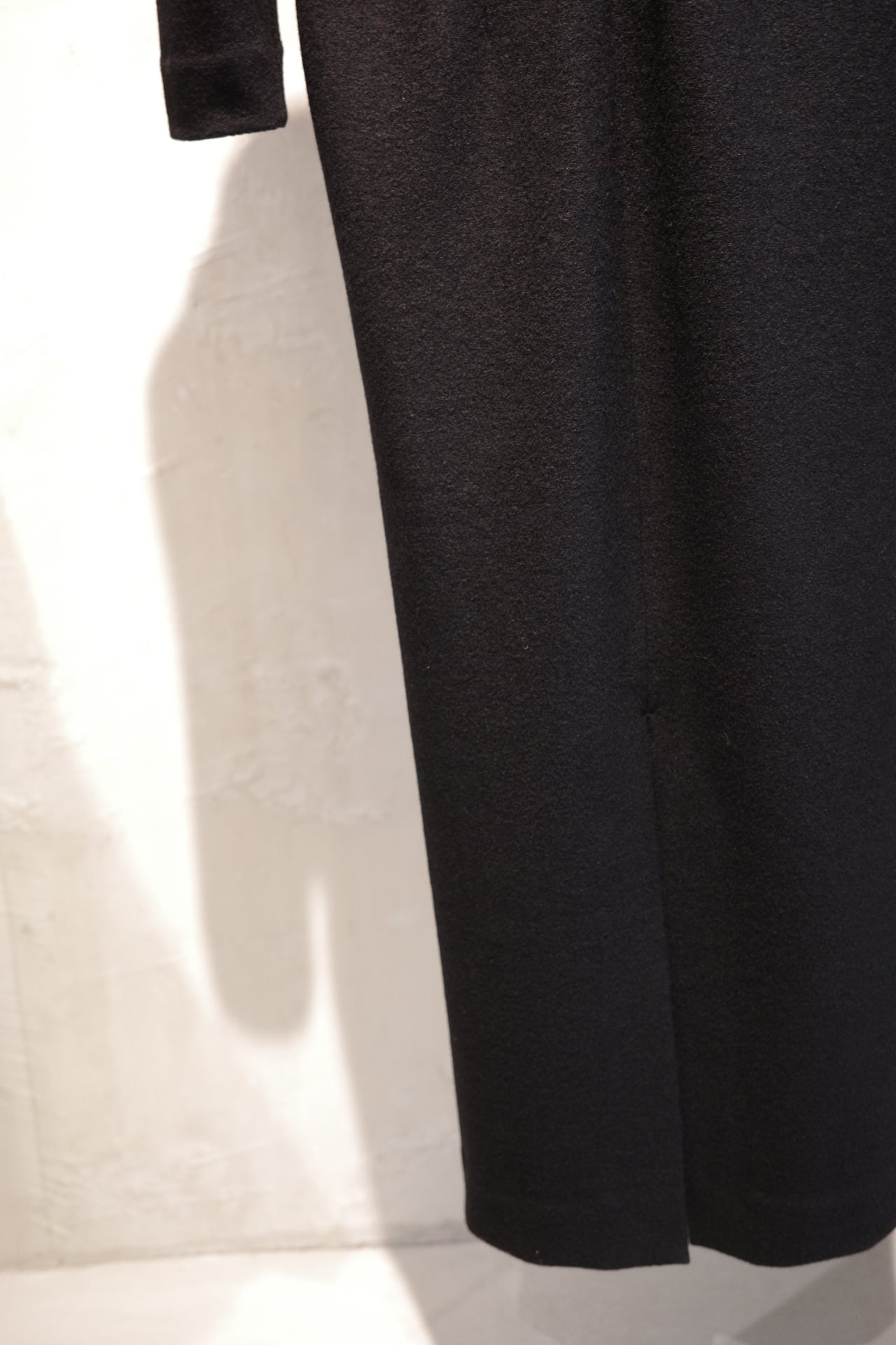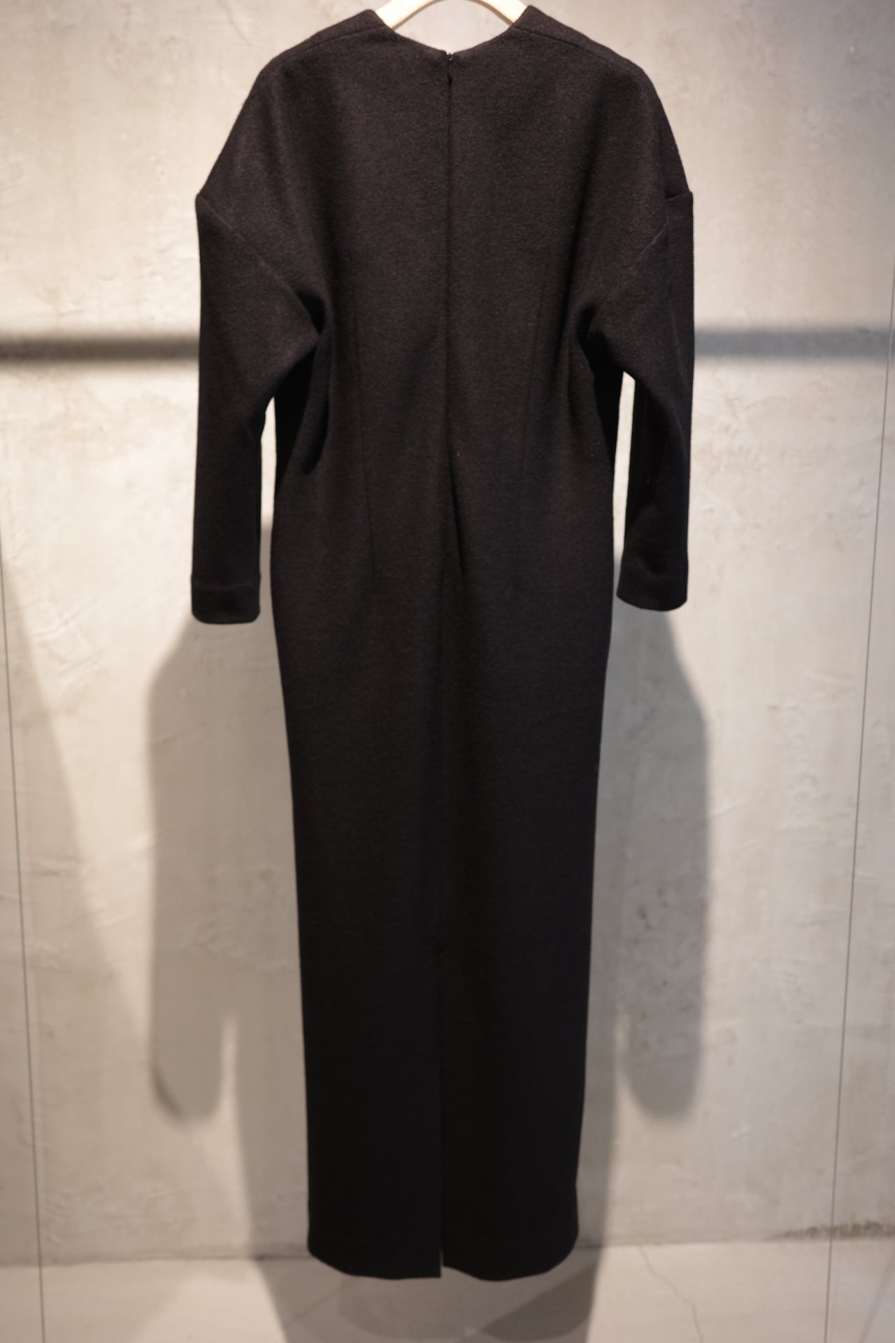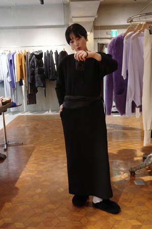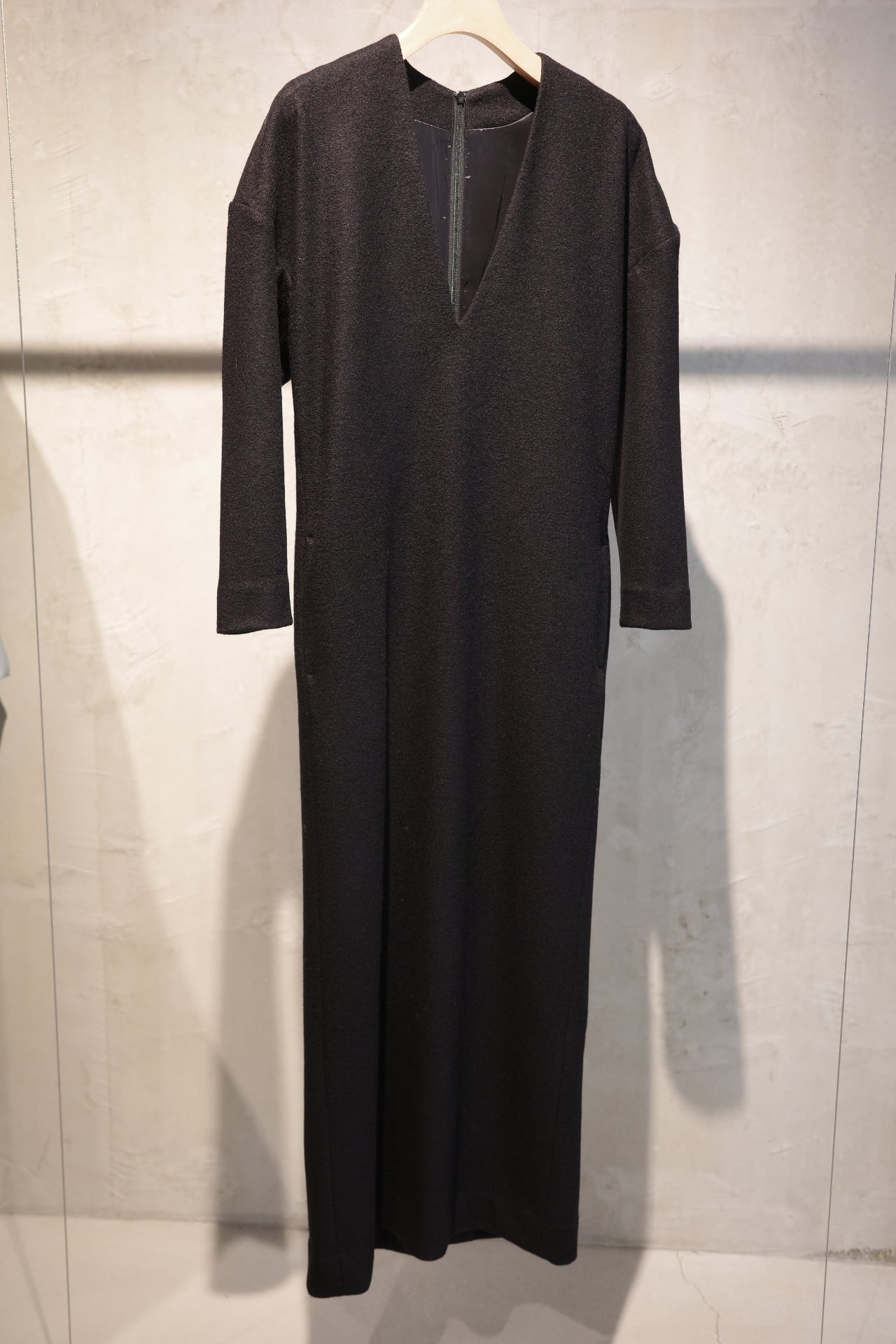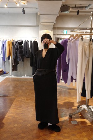 ウールジャージーのラインドレスのDINE。今から寒い時期に向けてヘビロテで着れる一癖あるけどレギュラーになれるドレスです。深い黒、深い胸元、広めの肩幅、絞った袖、やや短めの袖丈、ダーツで絞った背中、歩きやすく深めに入れたスリット、スッとしたポケット、