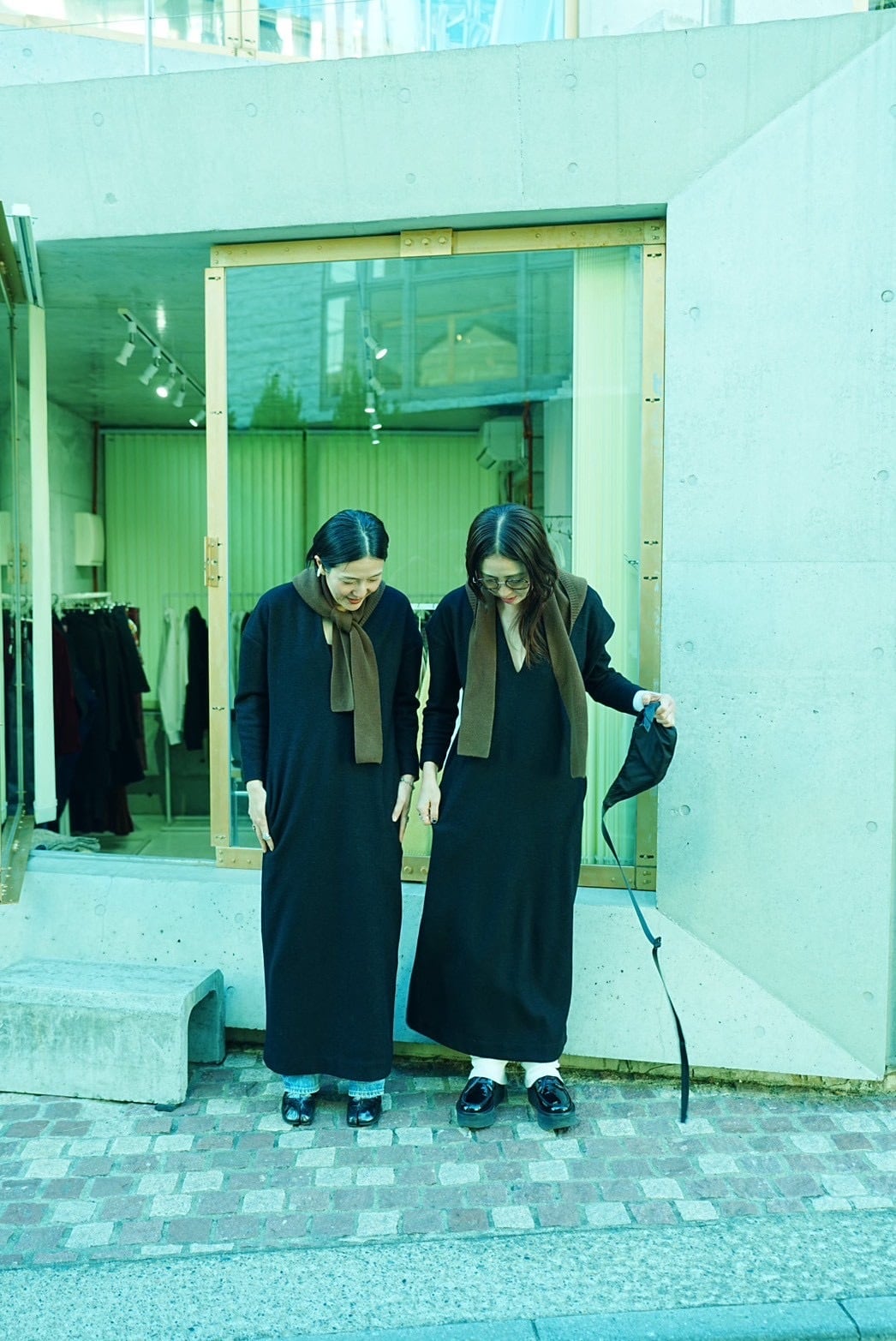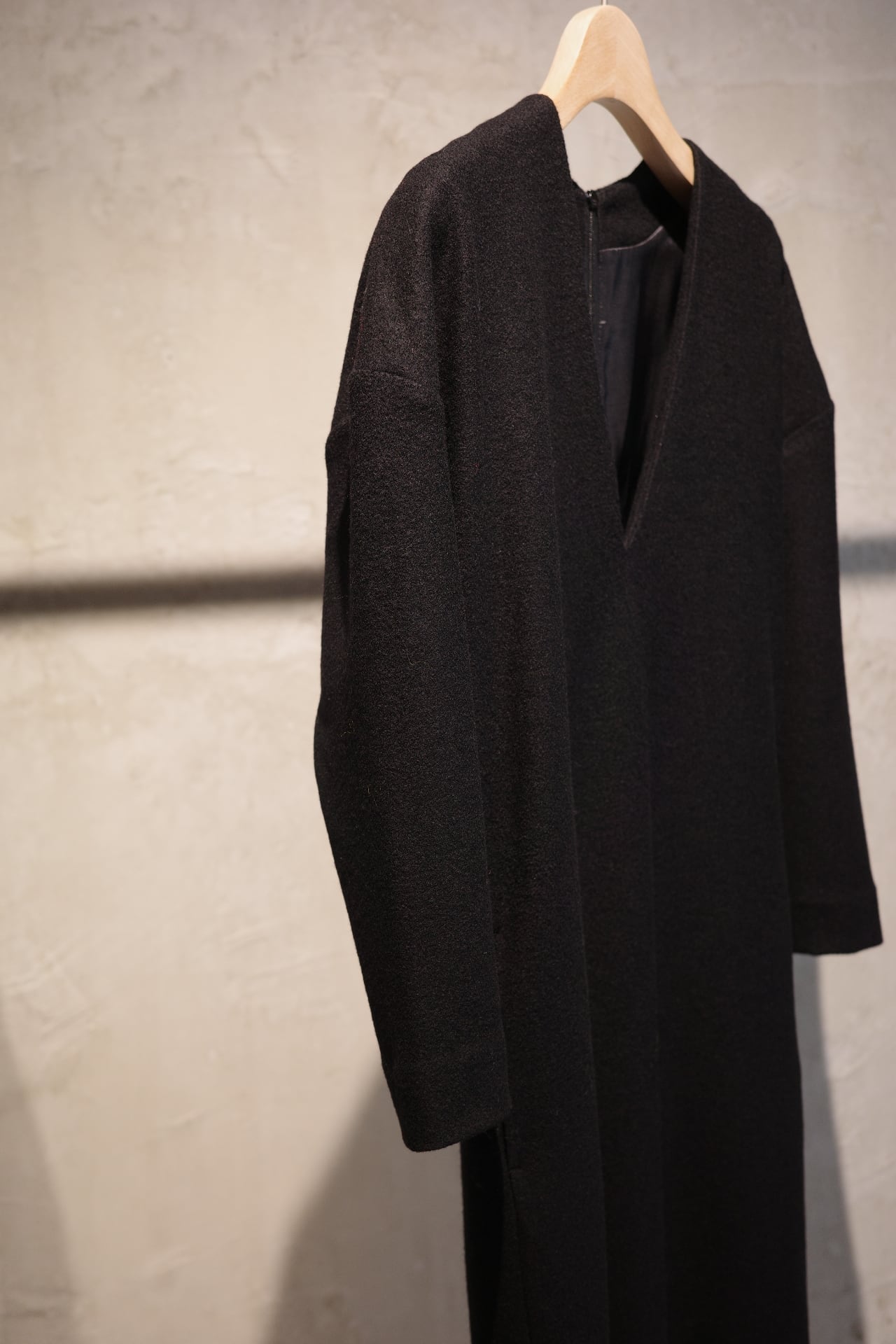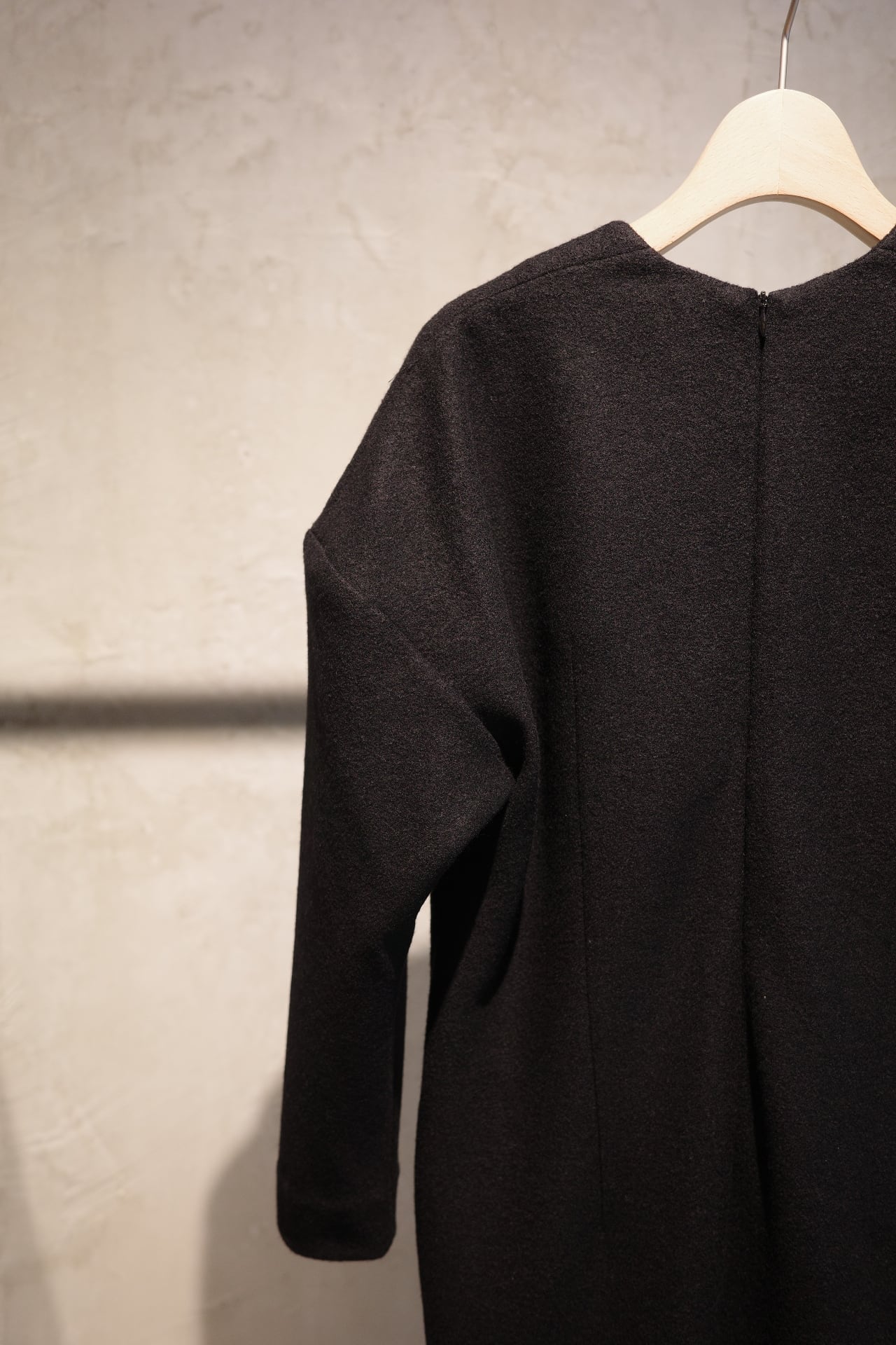 ウールジャージーのラインドレスのDINE。今から寒い時期に向けてヘビロテで着れる一癖あるけどレギュラーになれるドレスです。深い黒、深い胸元、広めの肩幅、絞った袖、やや短めの袖丈、ダーツで絞った背中、歩きやすく深めに入れたスリット、スッとしたポケット、