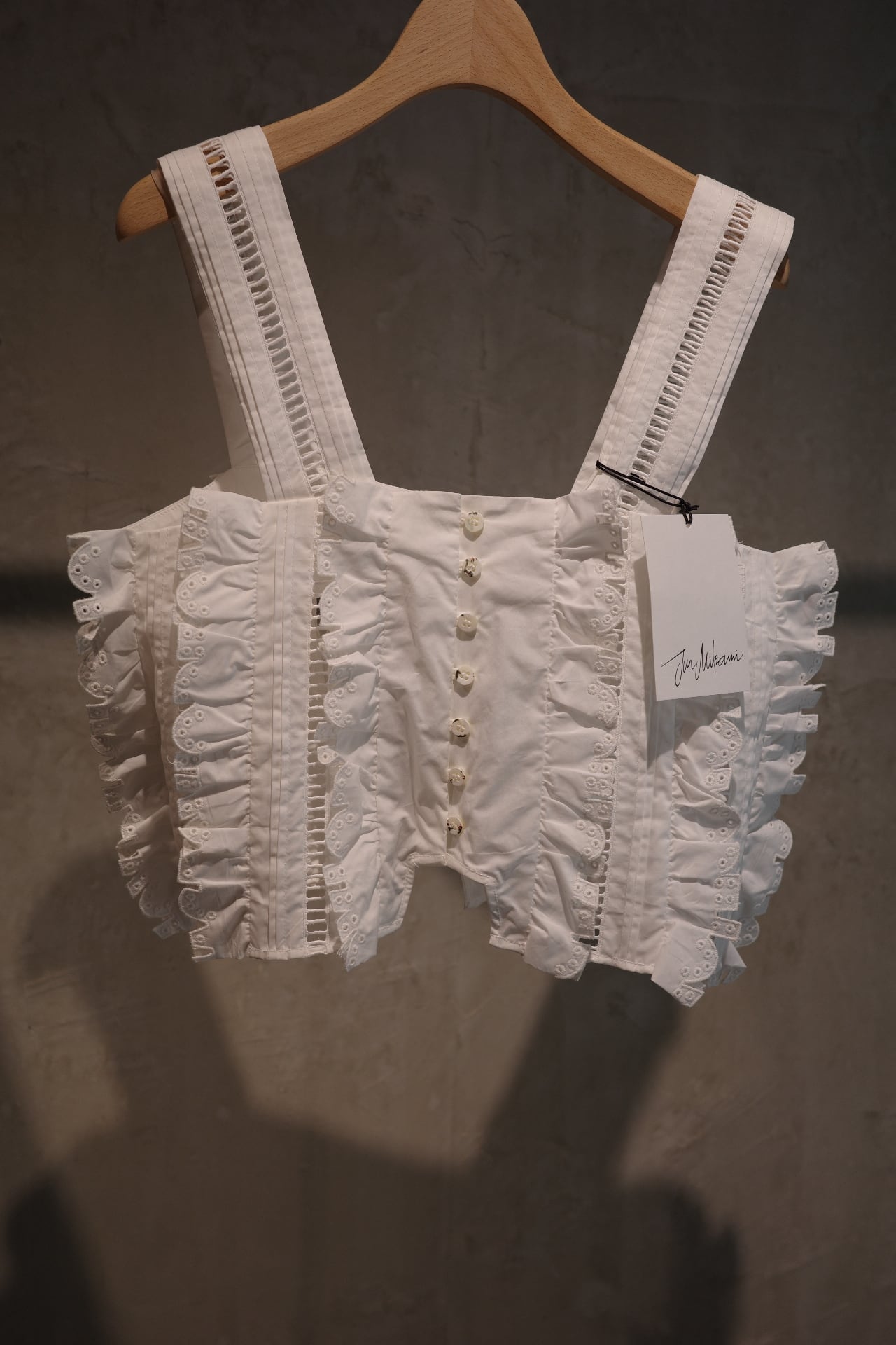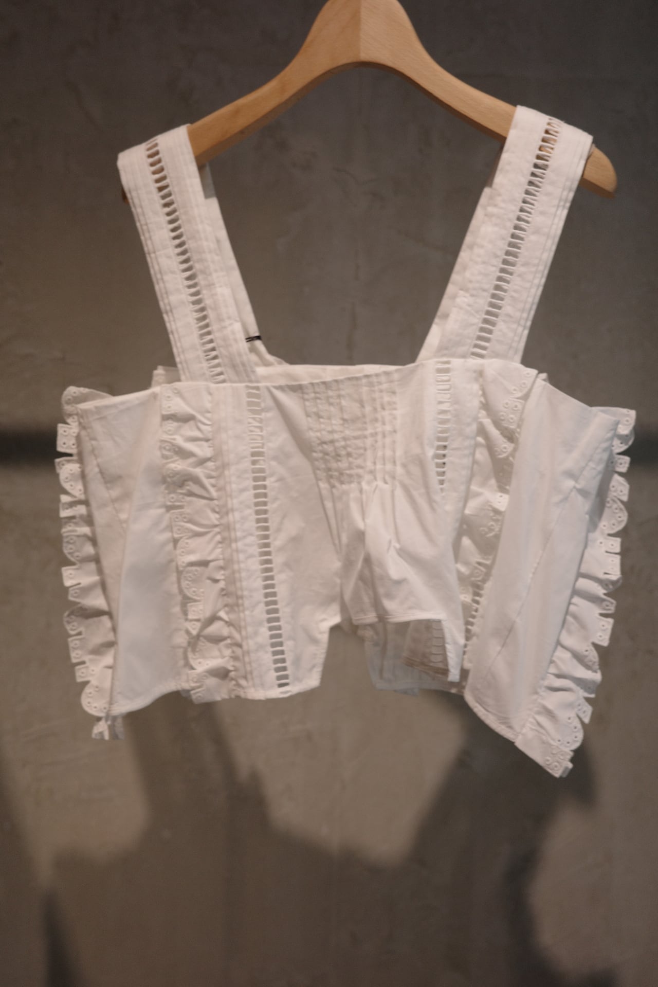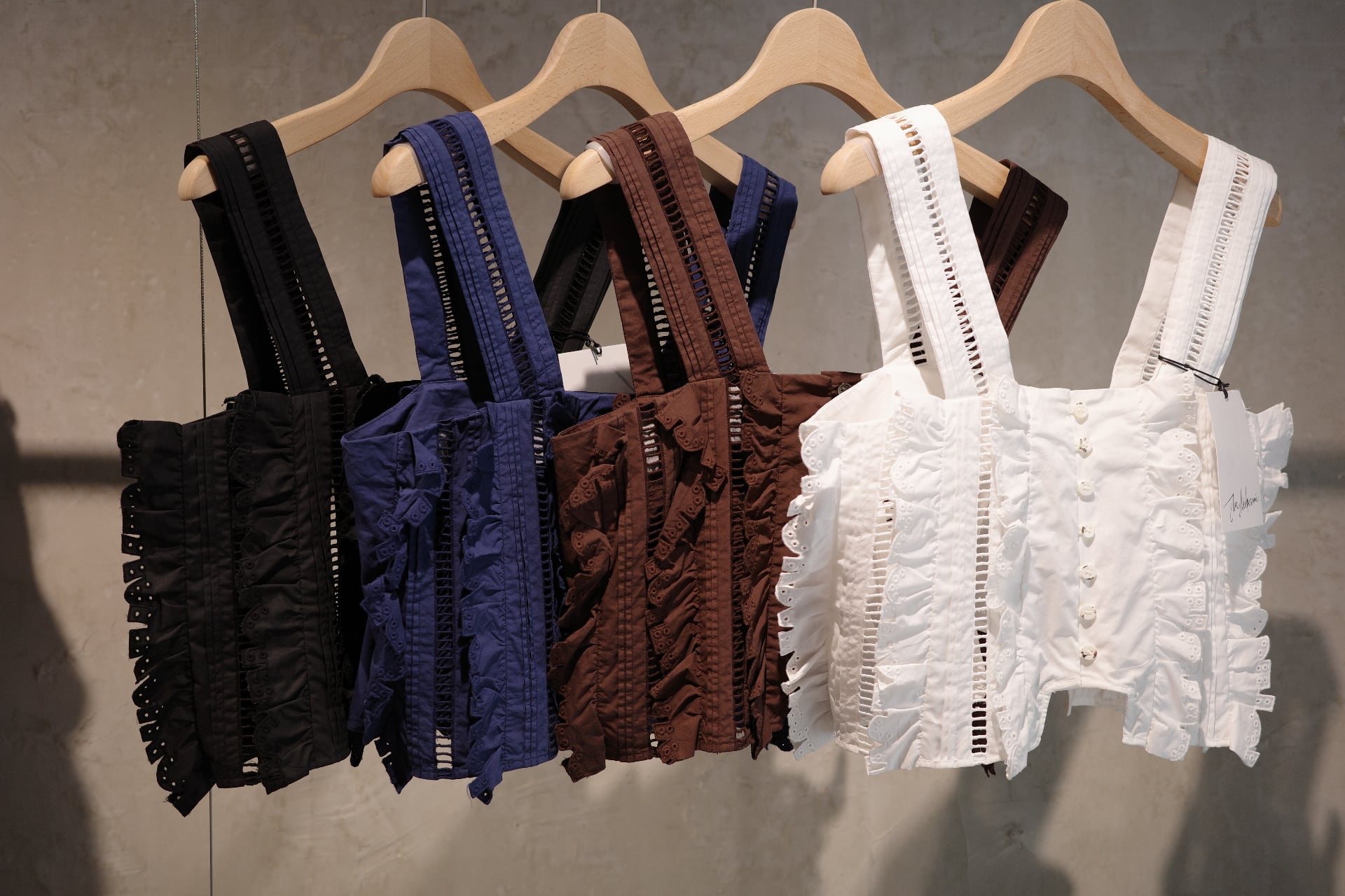 size/one size color/しろ、ネイビー、黒、茶(ikasa.限定) quality/綿100% カットラッフルのキャミソールです。夏場はもちろん、冬物素材とも相性良いのです! シーズンレスに使っていただけ、ずっと飽きない好きなデザイン。。。 茶色はikasa.別注カラーとなってます。特別なカラーでとてもステキに仕上げてくださいました!