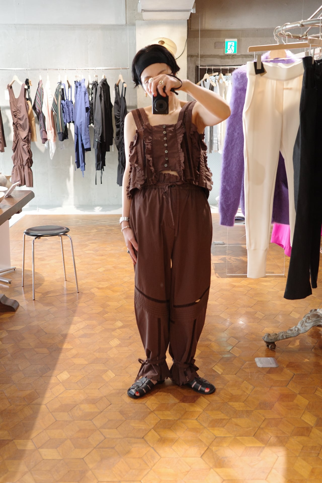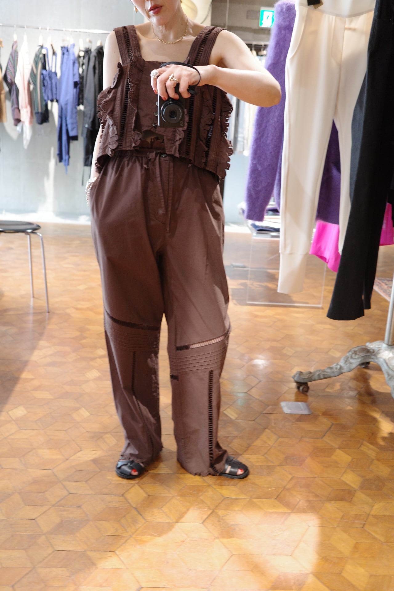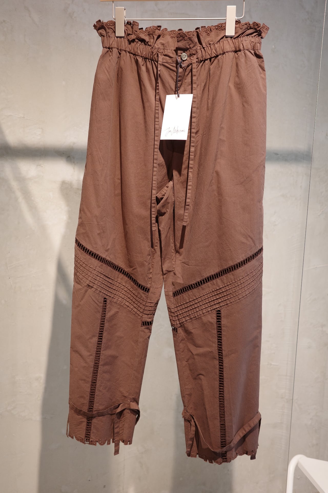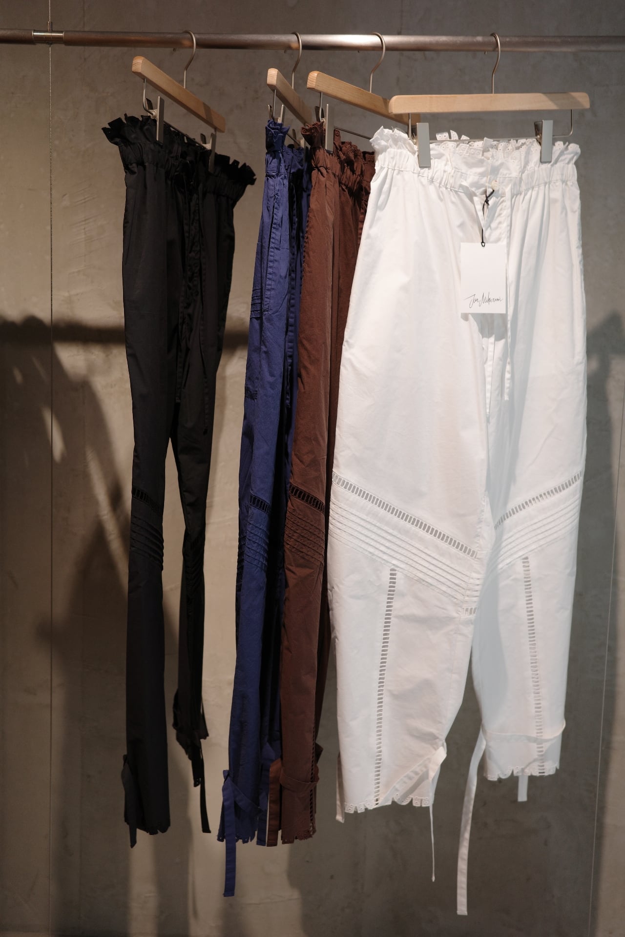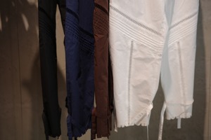 size/ONE SIZE color/しろ、ネイビー、黒、茶(ikasa.限定) quality/綿100% カットラッフルシリーズのパンツです。 ウエストは紐です。 裾も絞って頂いても、もしくはそのまま履いて頂いても ストンとしたシルエットで履いて頂けます♡レース部分も涼しいので真夏も快適に履いて頂けるパンツです!