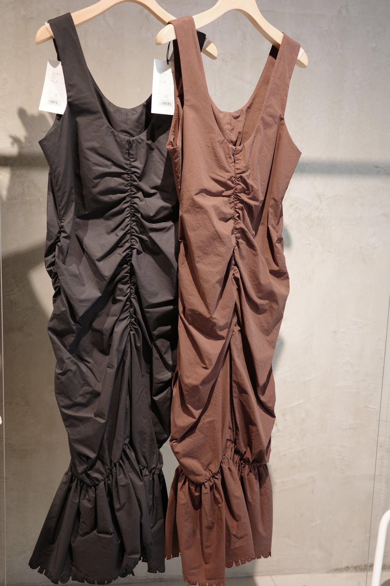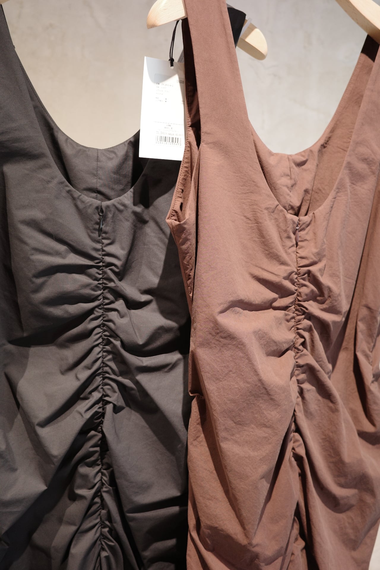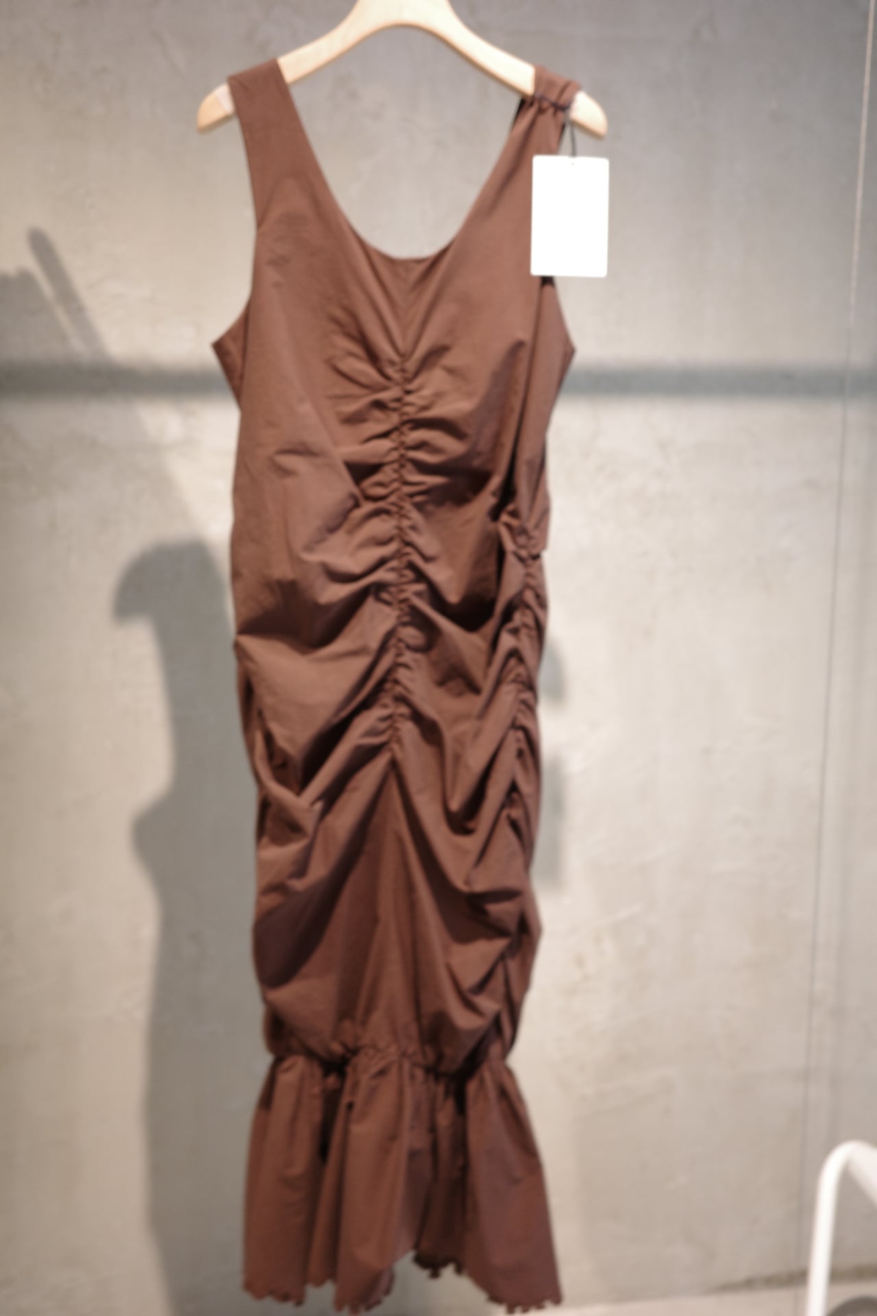 color/黒、茶(ikasa.別注) size/ONE SIZE フロントに施されたギャザーが自然にシルエットを美しく見せてくれるワンピースです。 裾は絞られたデザインになりますがゴムのため歩きやすいデザインとなっております。 甘くなりすぎないデザインで、モード感もあり、女性らしさもあります。 デイリーにラフに着ても、ちょっとしたお出かけまで、活用していただけるワンピースです。