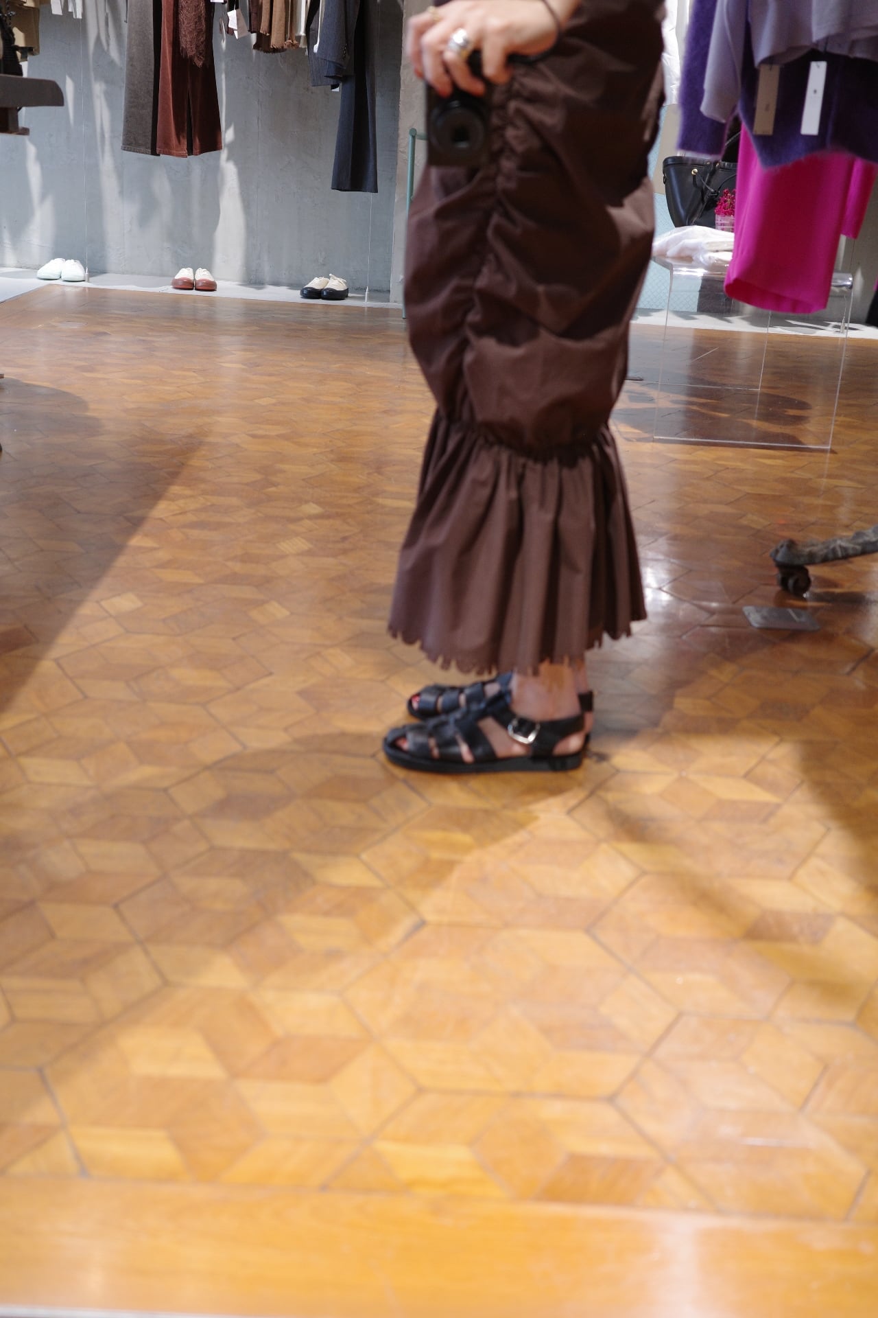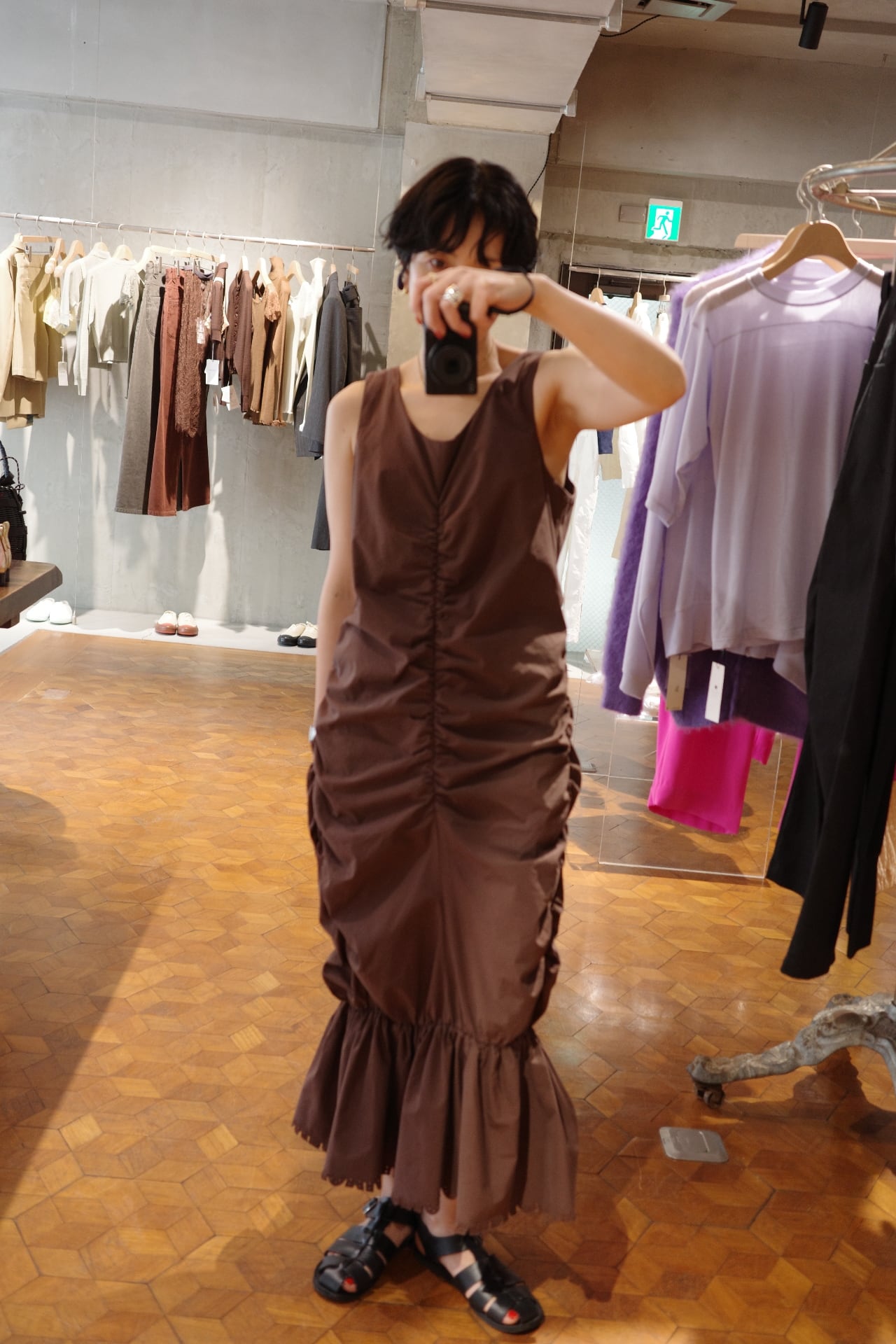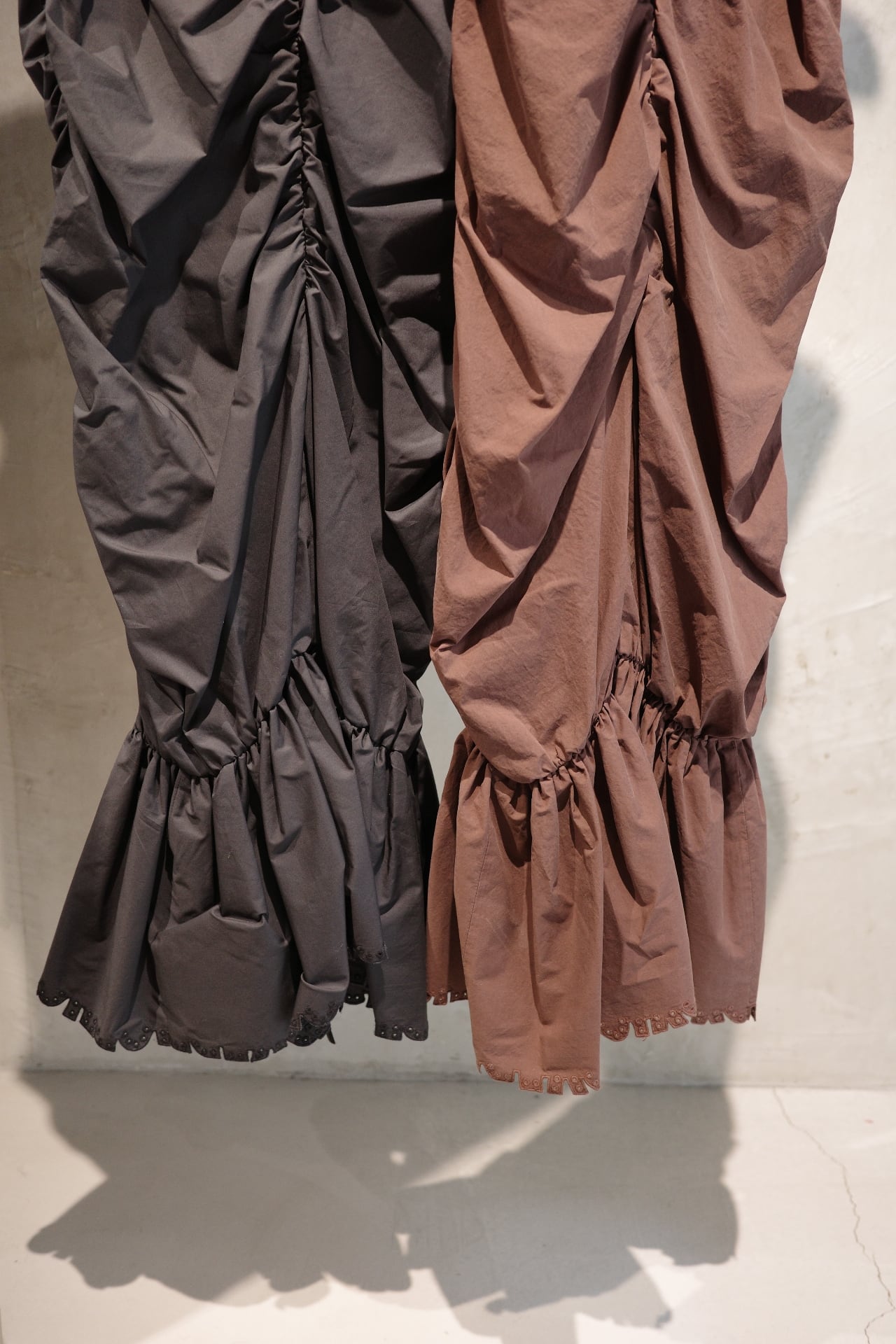 color/黒、茶(ikasa.別注) size/ONE SIZE フロントに施されたギャザーが自然にシルエットを美しく見せてくれるワンピースです。 裾は絞られたデザインになりますがゴムのため歩きやすいデザインとなっております。 甘くなりすぎないデザインで、モード感もあり、女性らしさもあります。 デイリーにラフに着ても、ちょっとしたお出かけまで、活用していただけるワンピースです。
