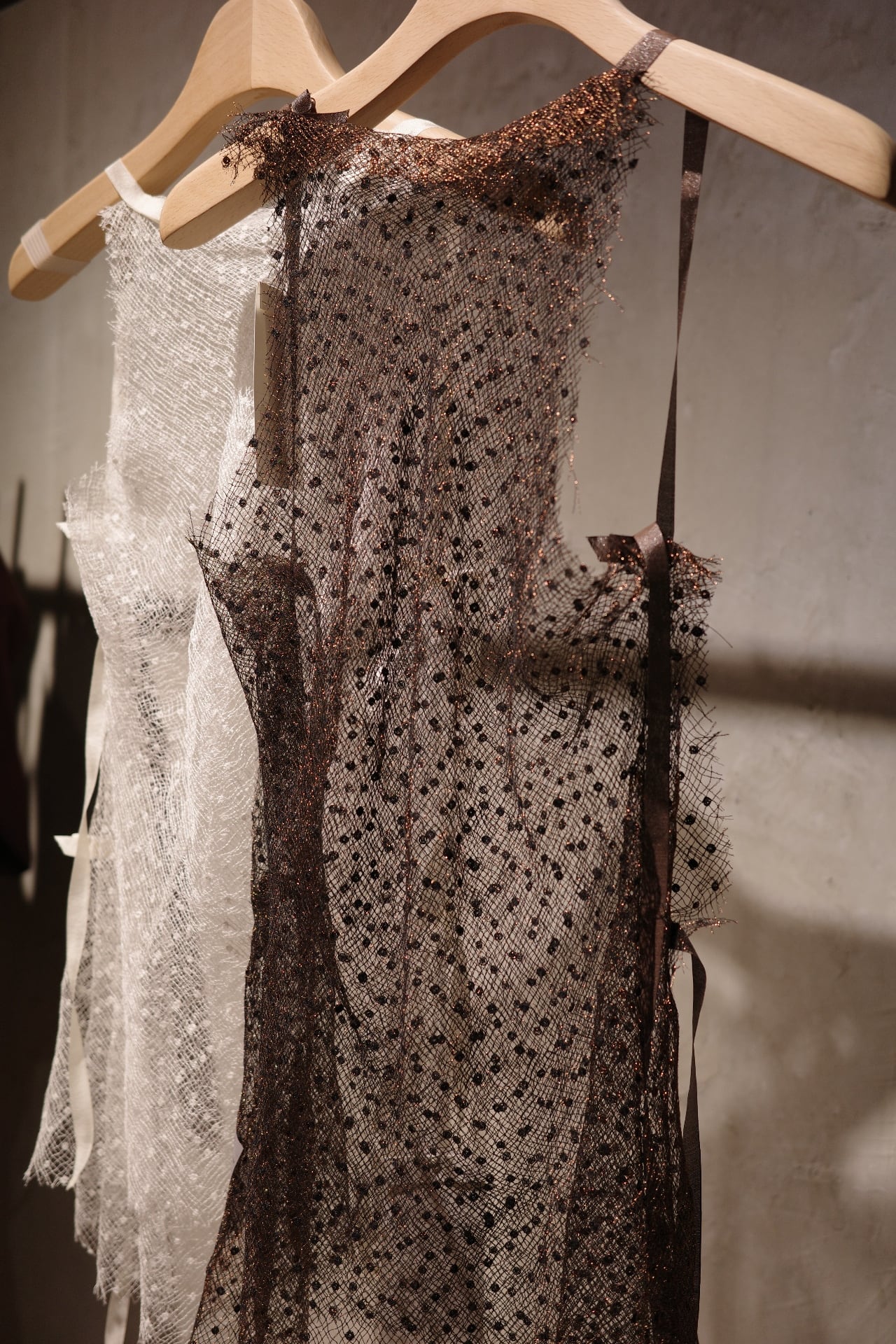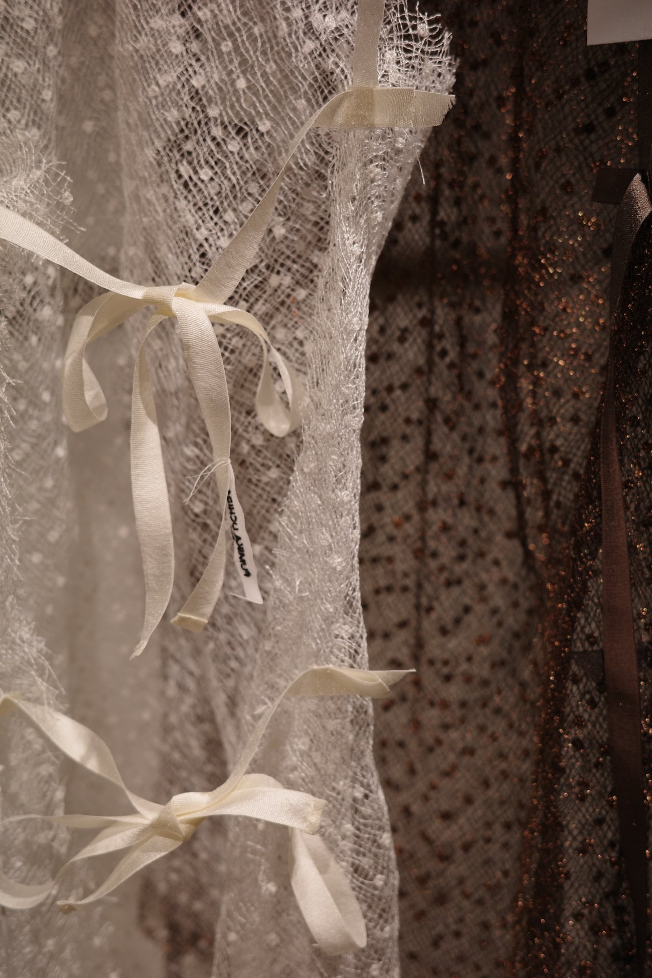 バイヤス編みによるしなやかなフィットに、二重に仕立てたチュールの重なりが、奥行きを生み出します。バストとウエスト位置のリボンテープを結んで着用いただけます。