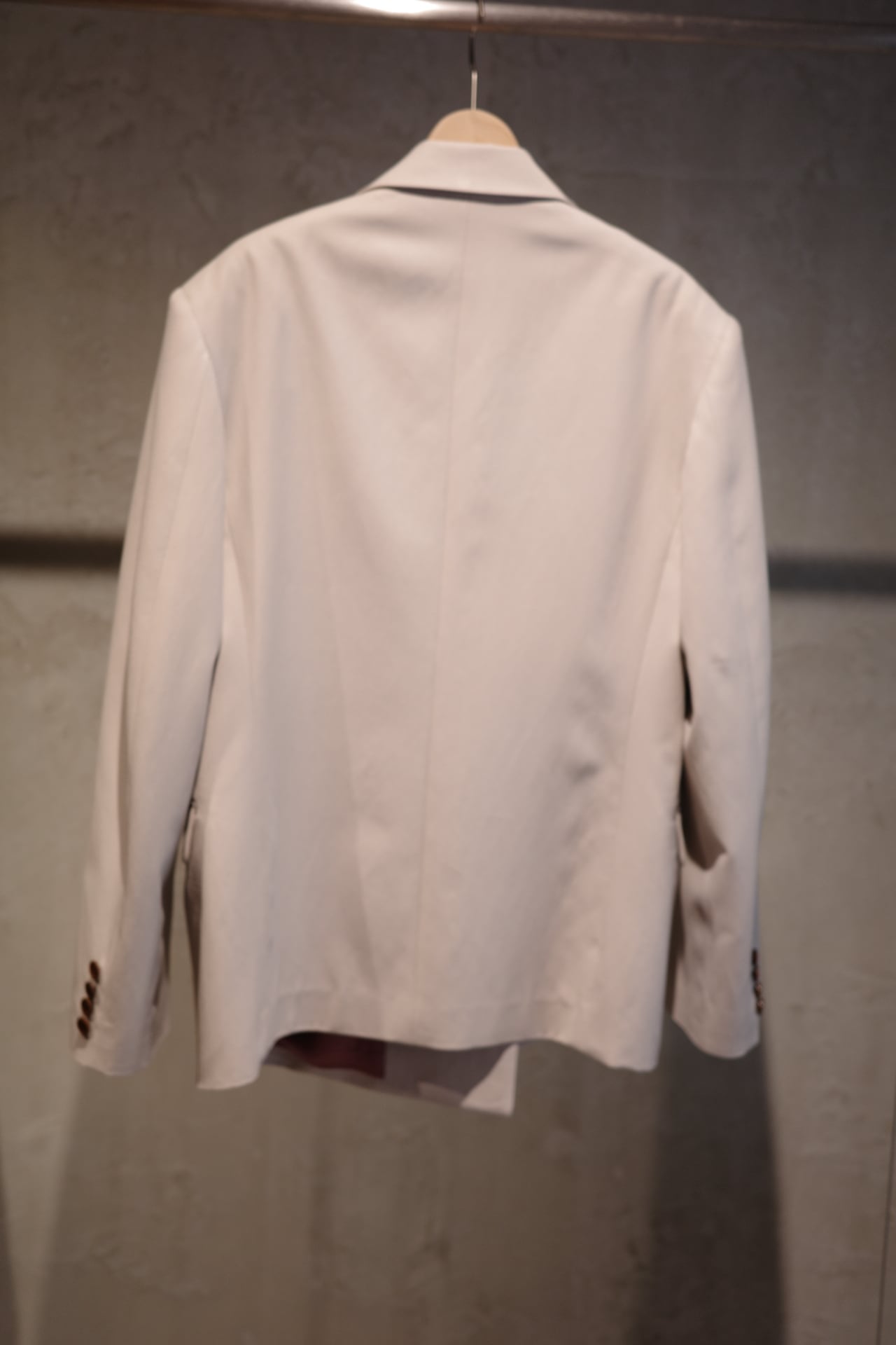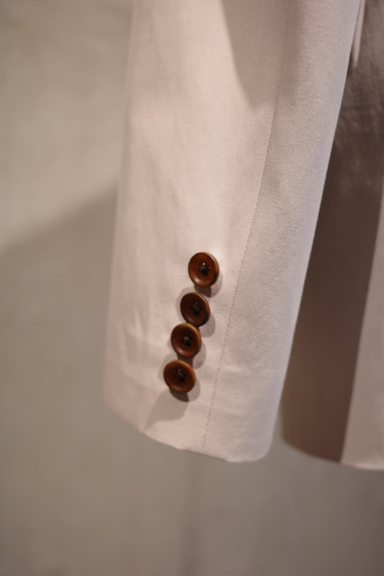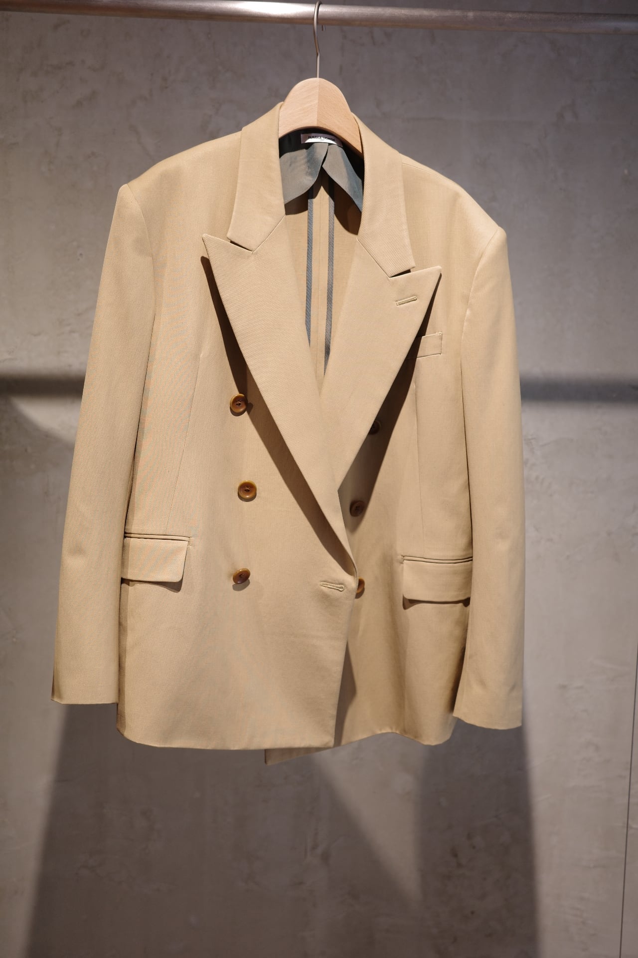 color/LILAC,KHAKIBEIGE size/36 Material/本体 レーヨン54% 綿 46% 裏地 キュプラ62% アセテート38% 別布 綿100% SIZE/着丈69.5 肩幅47 身幅54.5 袖丈60 ヴィスコースコットンの程よいドレープ感を、もつツイン生地で仕立てたダブルジャケット。 肩のラインをやや深めのピークドラペルがシャープな印象を添えます。