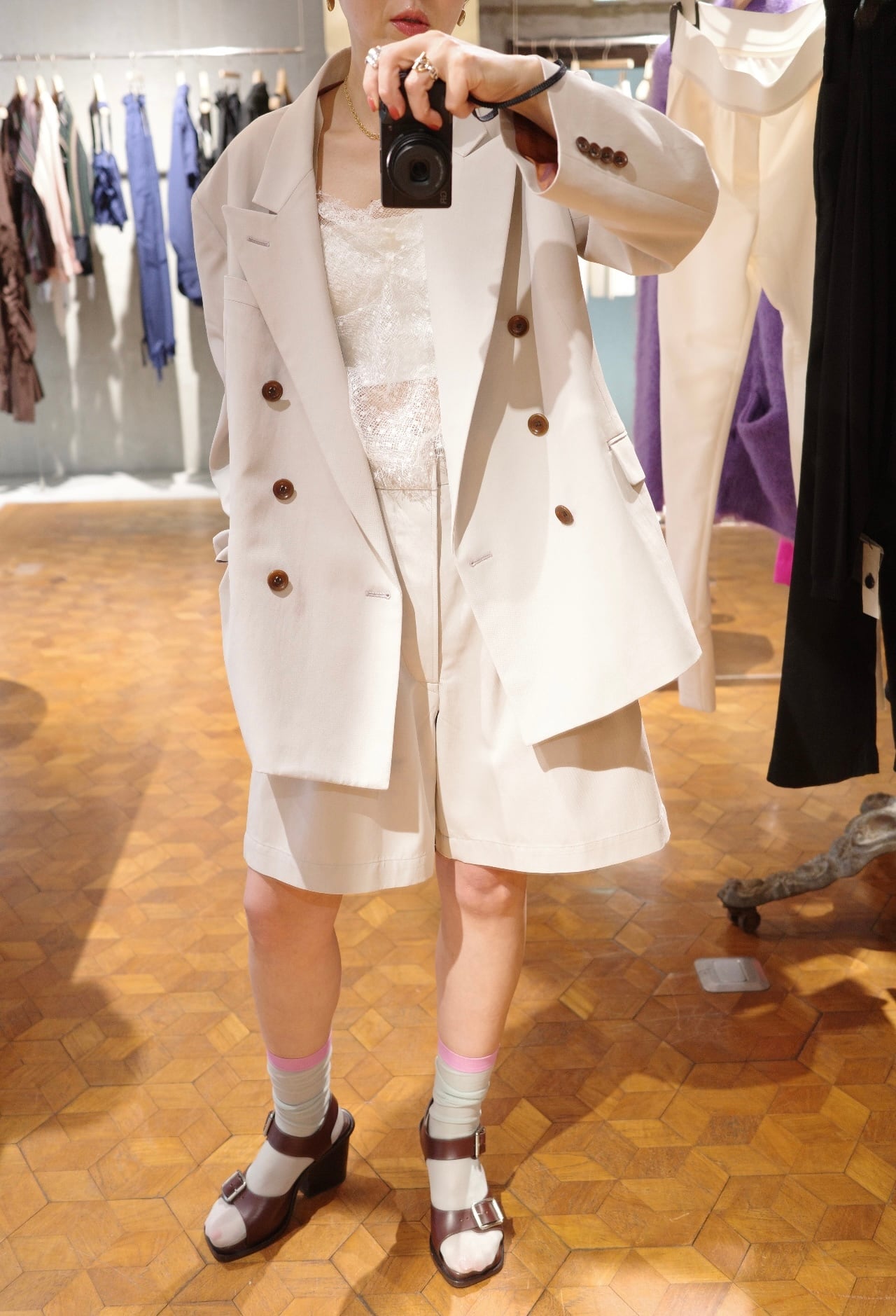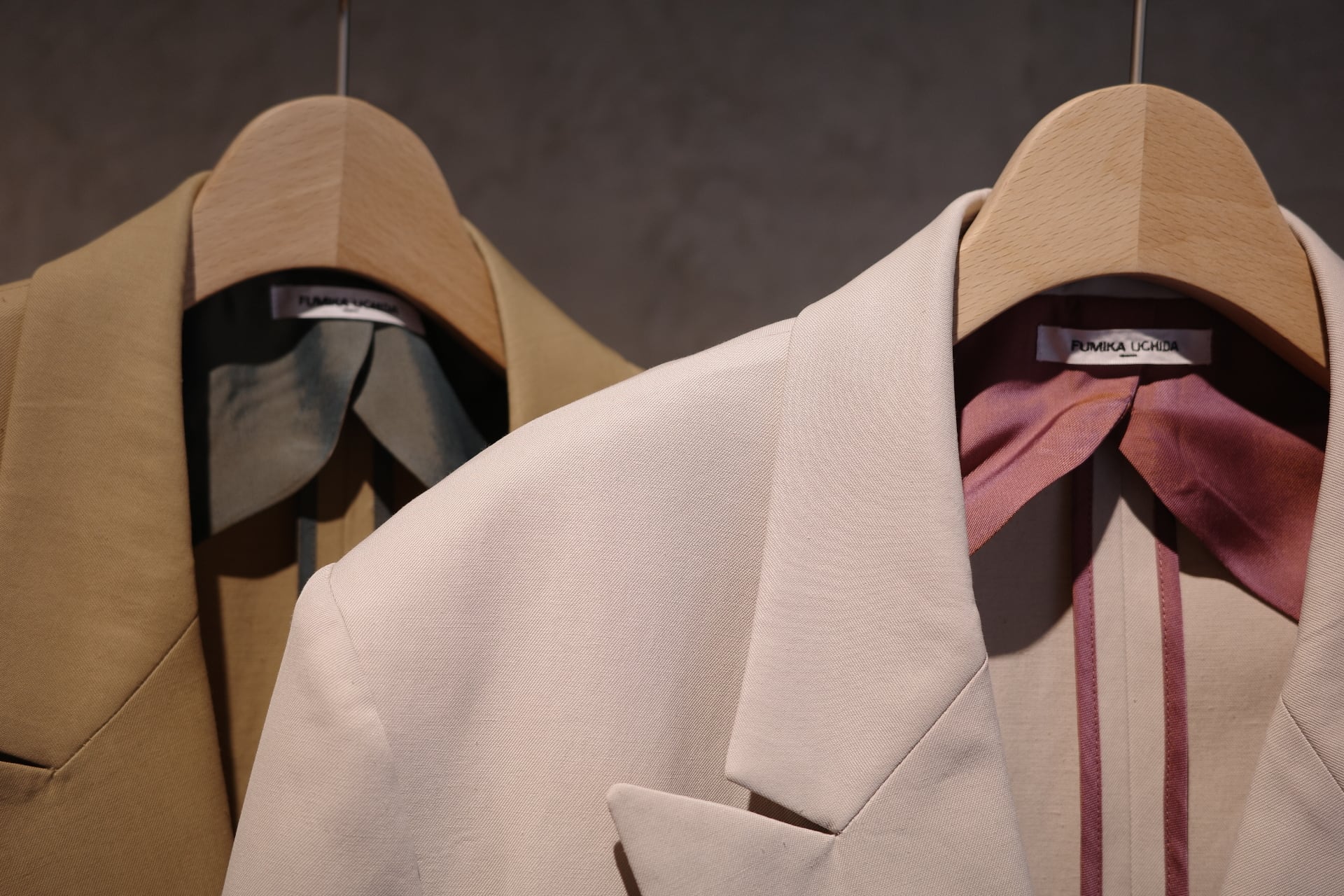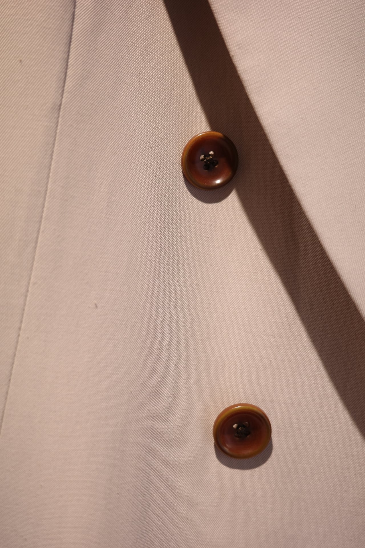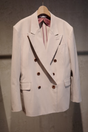 color/LILAC,KHAKIBEIGE size/36 Material/本体 レーヨン54% 綿 46% 裏地 キュプラ62% アセテート38% 別布 綿100% SIZE/着丈69.5 肩幅47 身幅54.5 袖丈60 ヴィスコースコットンの程よいドレープ感を、もつツイン生地で仕立てたダブルジャケット。 肩のラインをやや深めのピークドラペルがシャープな印象を添えます。