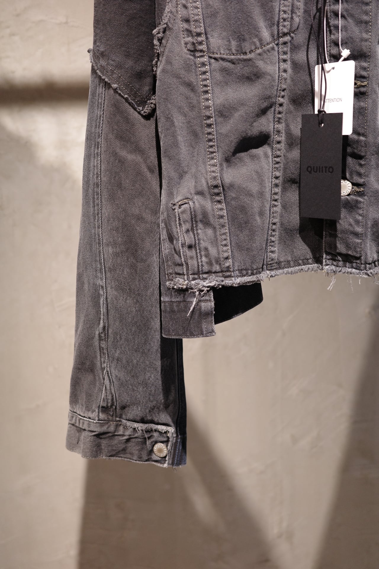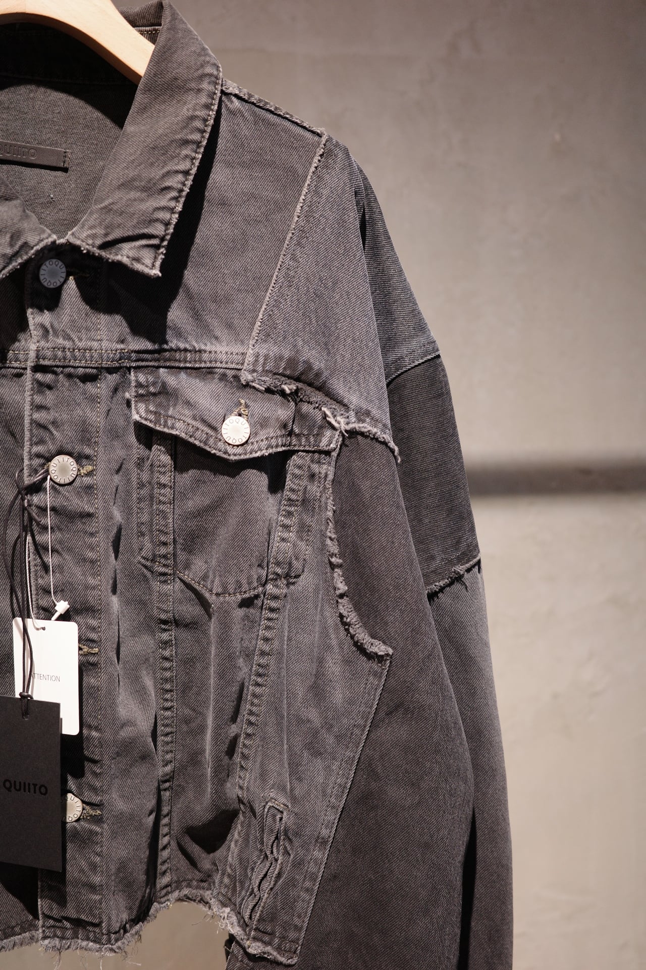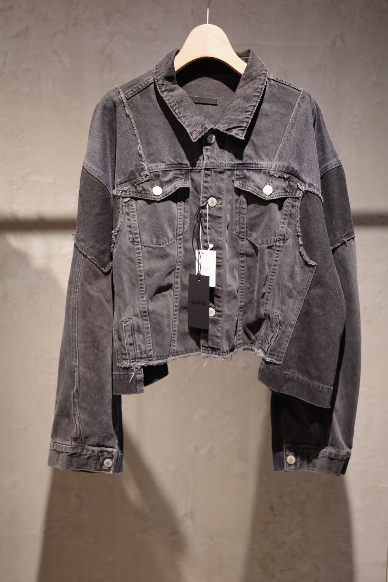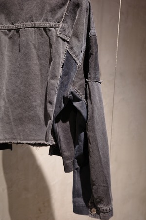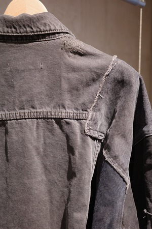 古着デニムをリメイクしたQUIITOの定番型ジャケットです。リメイク縫製後に黒でピグメント染めとバイオウォッシュ加工を施し、独特の風合いと色味を表現しました。古着元々の色差が少し残った奥行きのあるDARKGRAYに仕上げております。顔料を,使用している為色落ちがしやすいのでお取り扱いにご注意ください。
