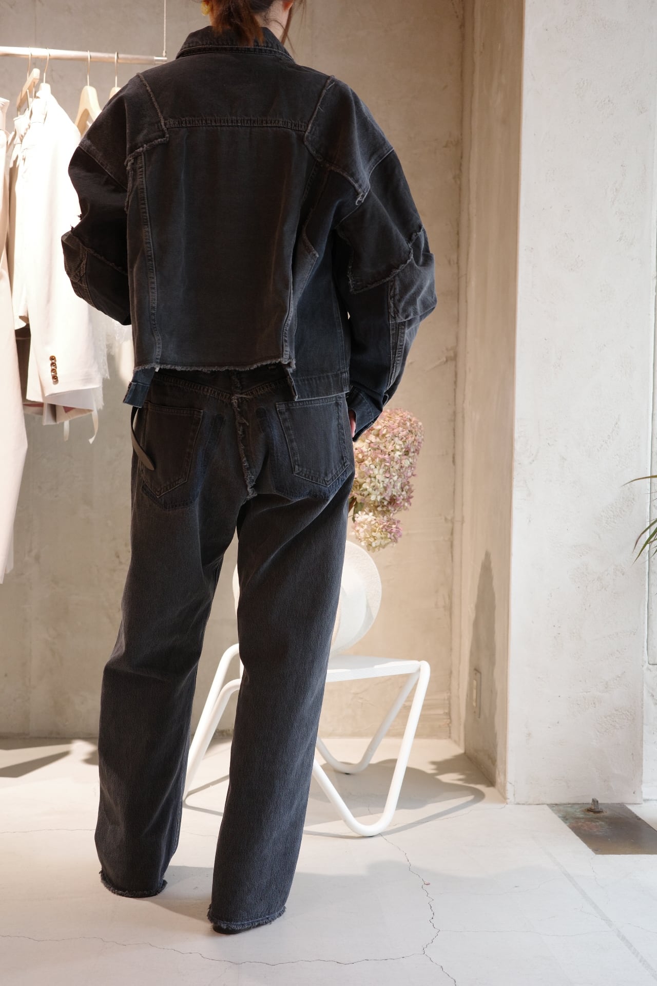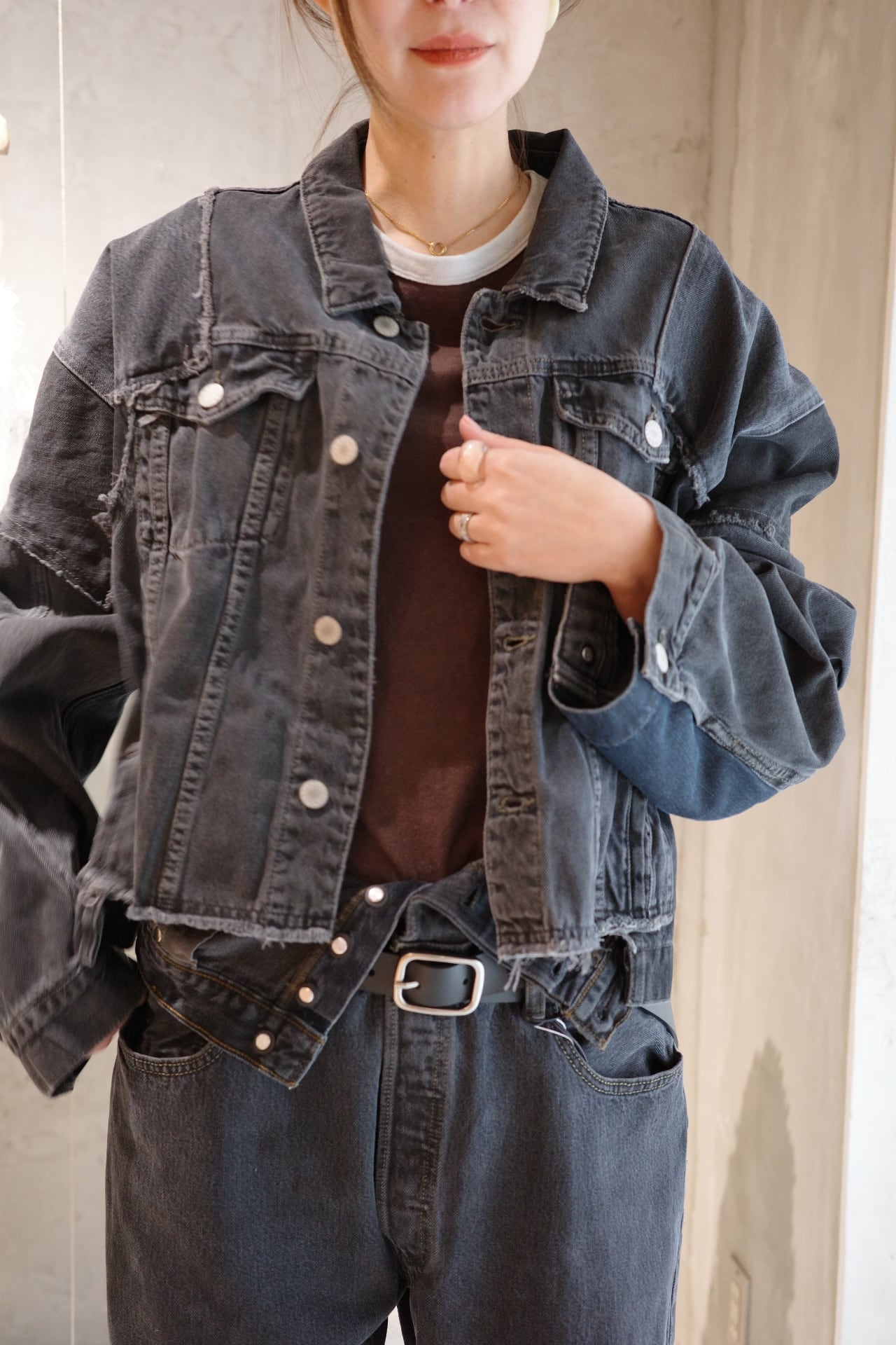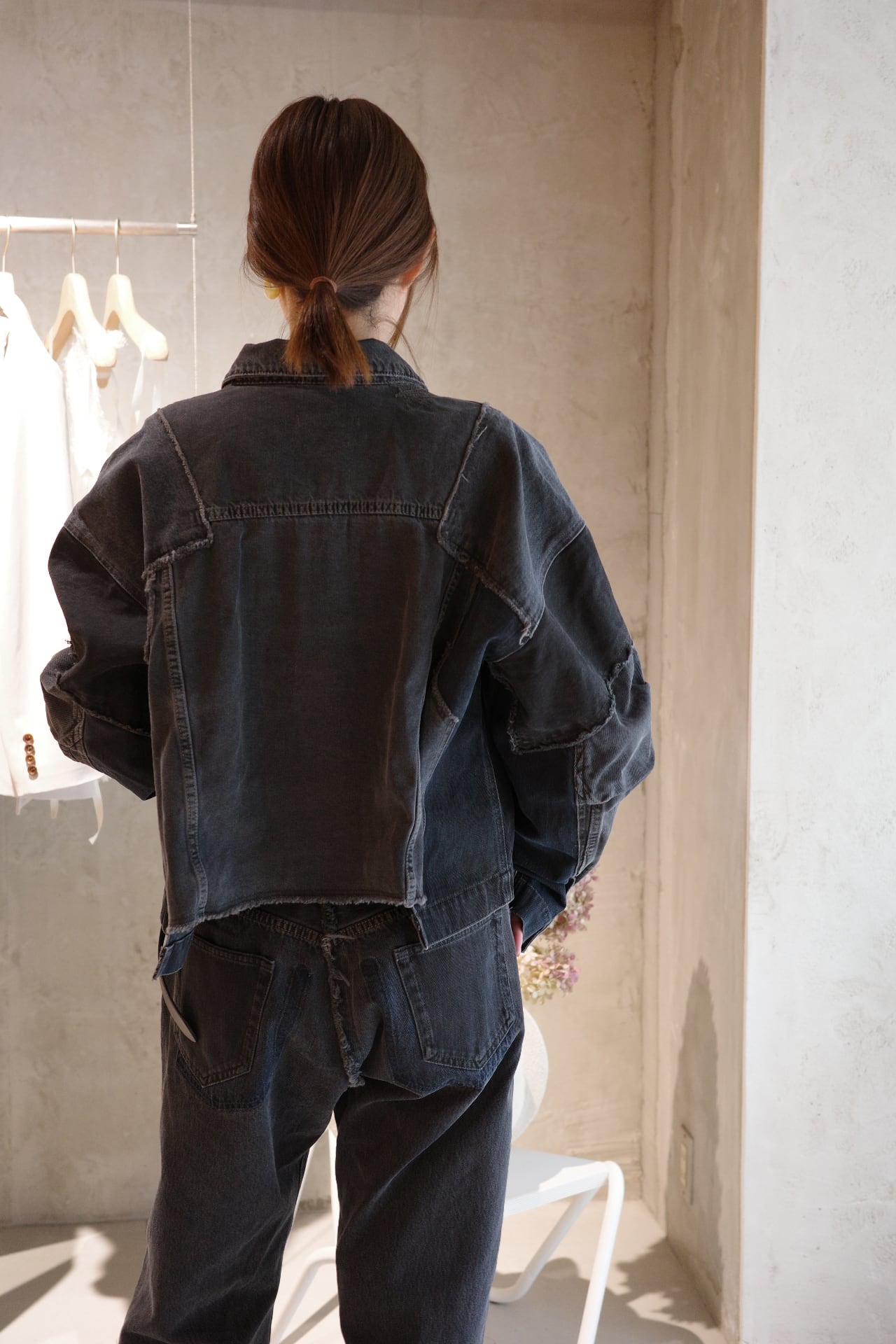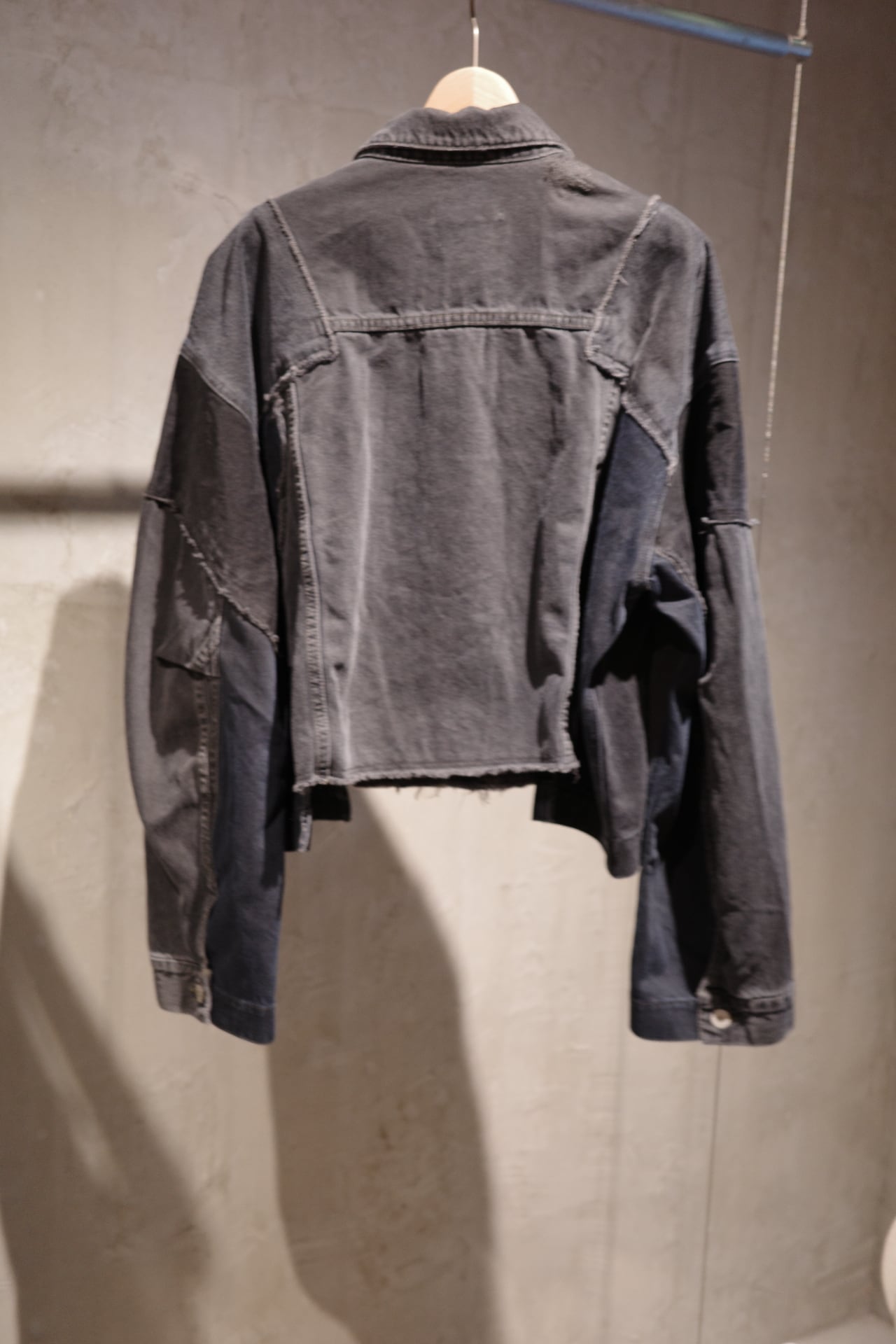 古着デニムをリメイクしたQUIITOの定番型ジャケットです。リメイク縫製後に黒でピグメント染めとバイオウォッシュ加工を施し、独特の風合いと色味を表現しました。古着元々の色差が少し残った奥行きのあるDARKGRAYに仕上げております。顔料を,使用している為色落ちがしやすいのでお取り扱いにご注意ください。