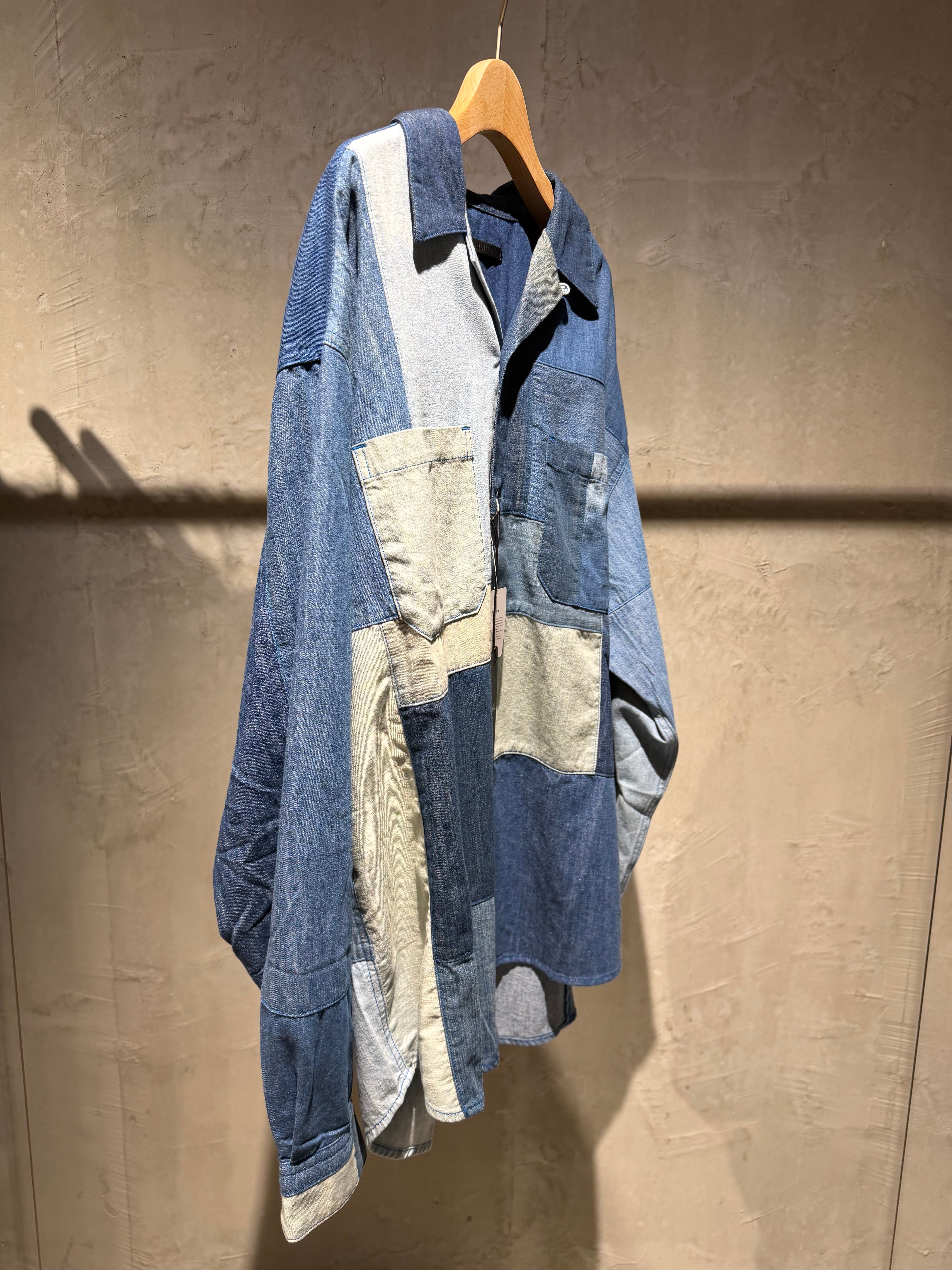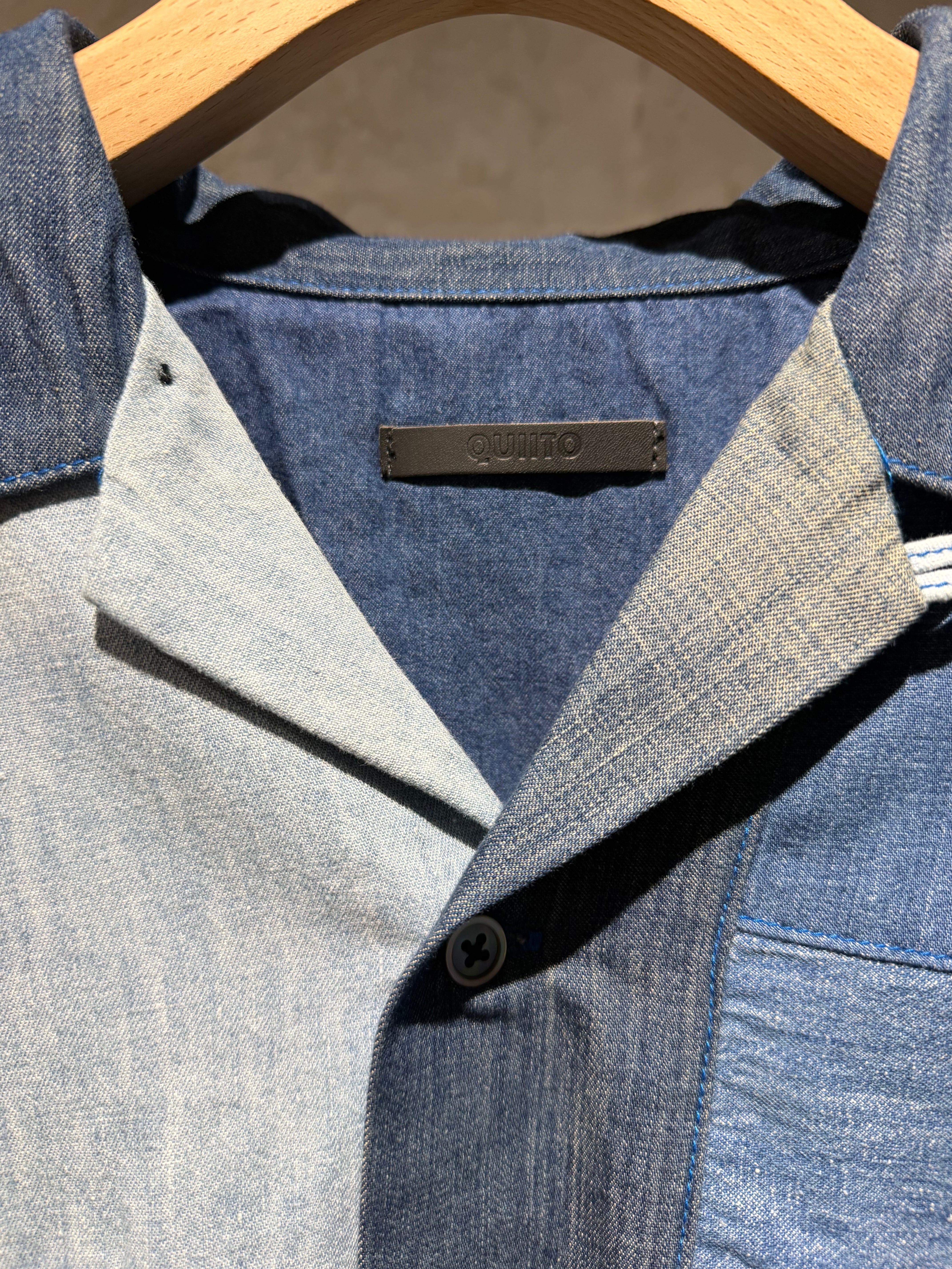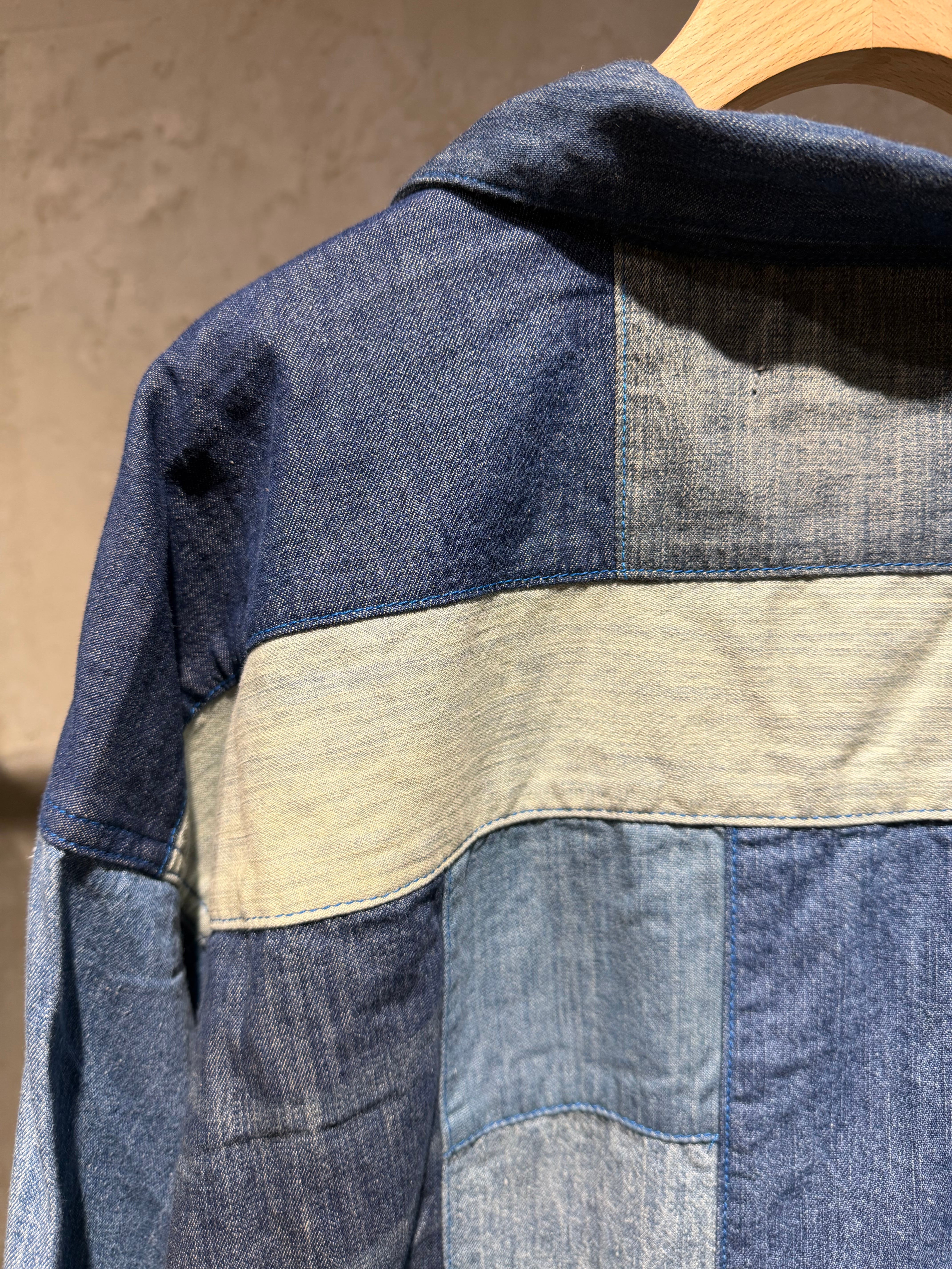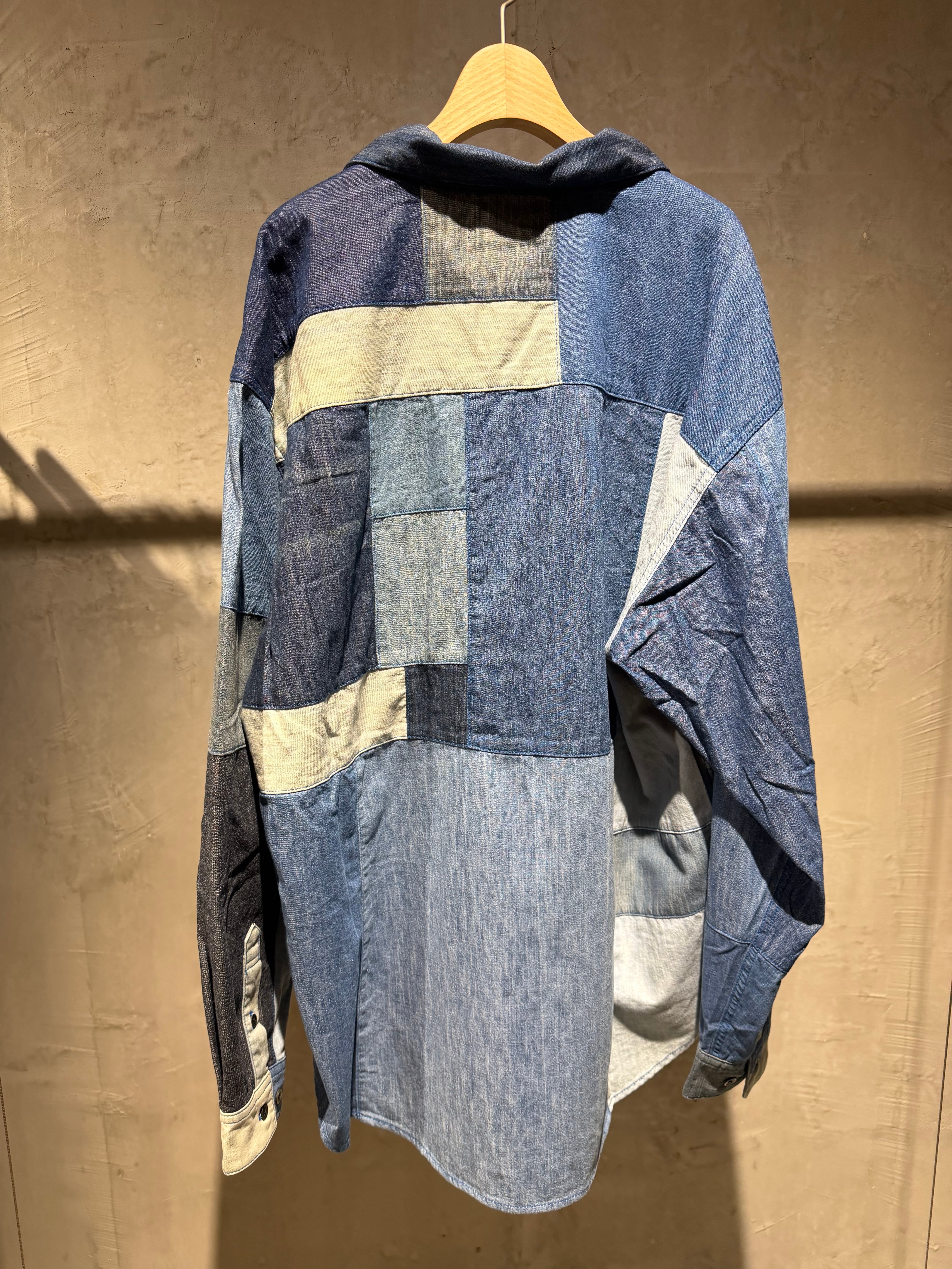 color/BLUE size/free 着丈86 身幅67 袖丈65.5(肩の切り替えより) 6種類の古着デニムシャツを,ランダムに配置した開襟シャツです。メンズのビッグサイズシャツをモチーフにしたワンサイズ展開です。最後に洗いをかけており,古着素体の生地の縮率が少しずつ違うことで抑揚が生まれて,表情が1着1着違った特別なものになります。 ユニセックスできていただけます。