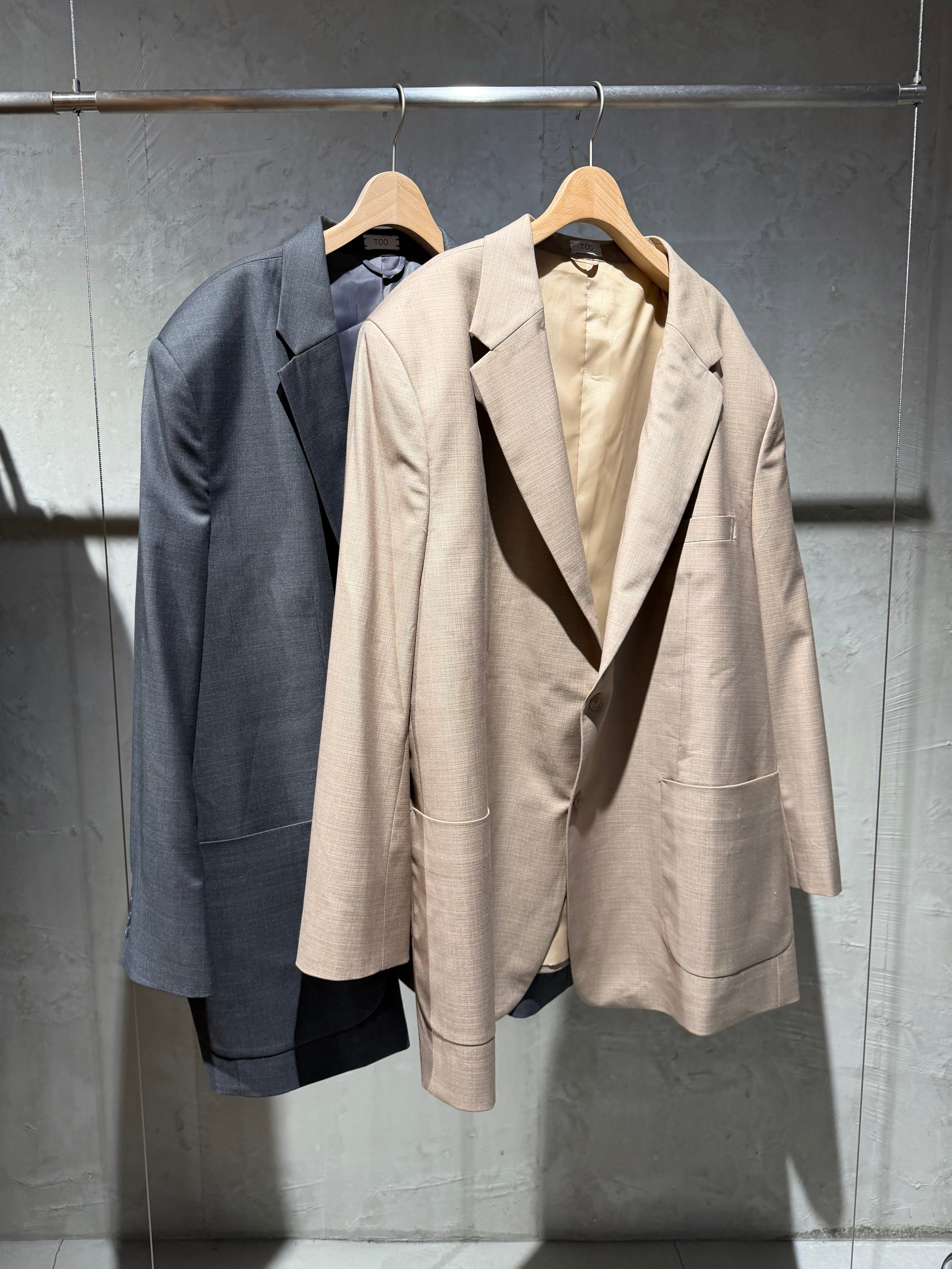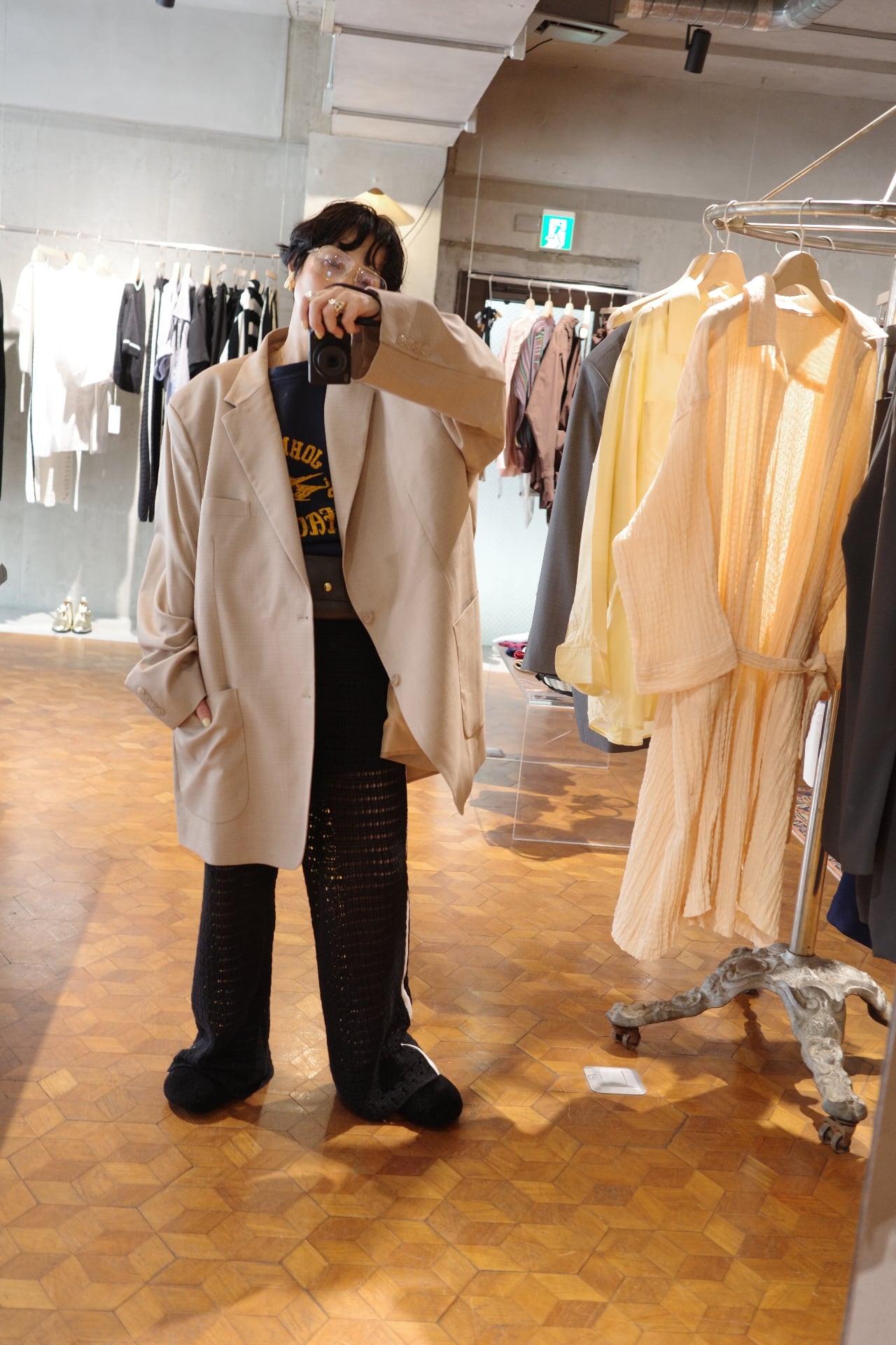 カシミア混のウールとレーヨンの上質な生地で仕立てたジャケット、パターンはメンズをベースにとてもオーバーサイズなビッグジャケットです。