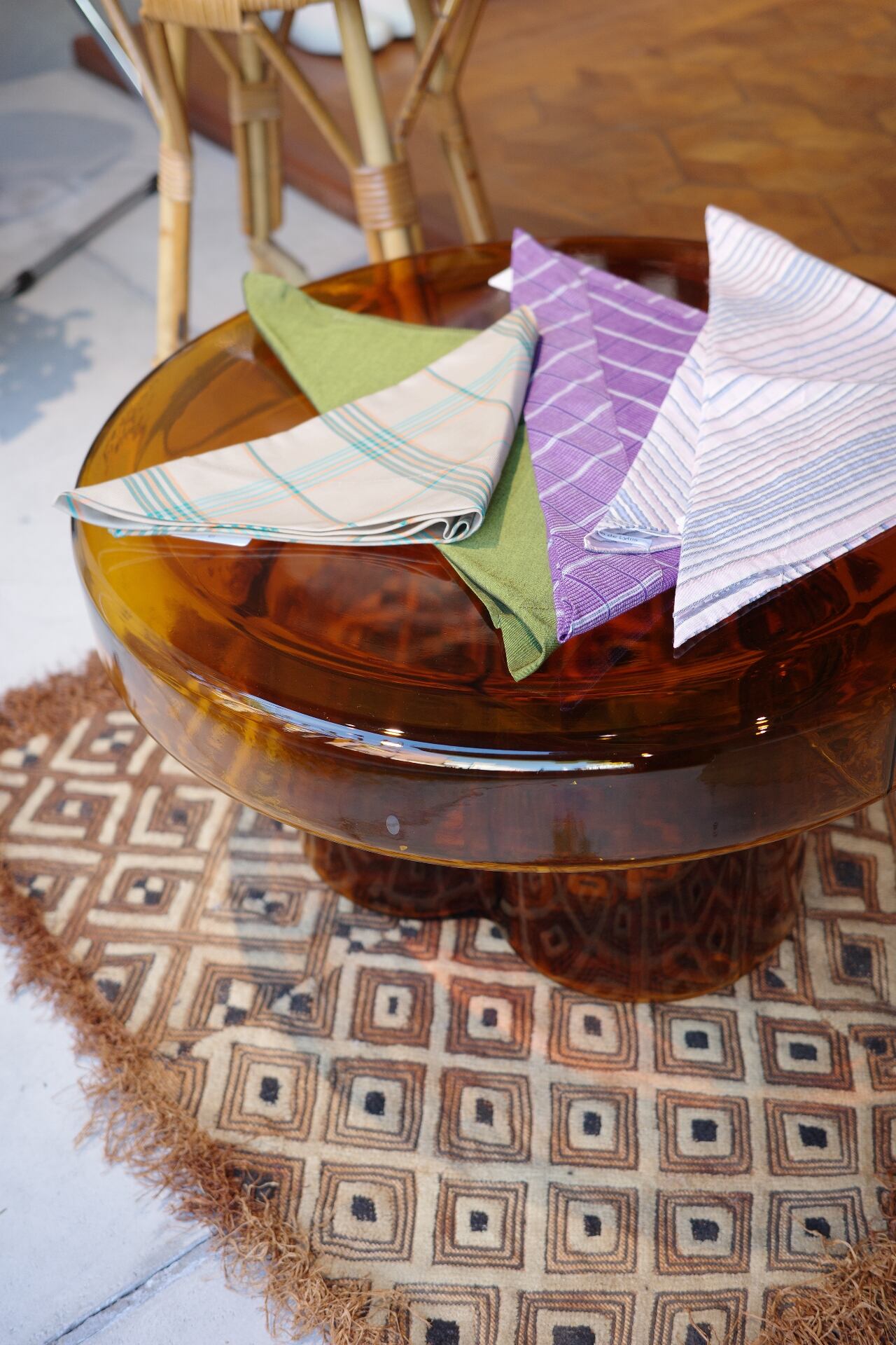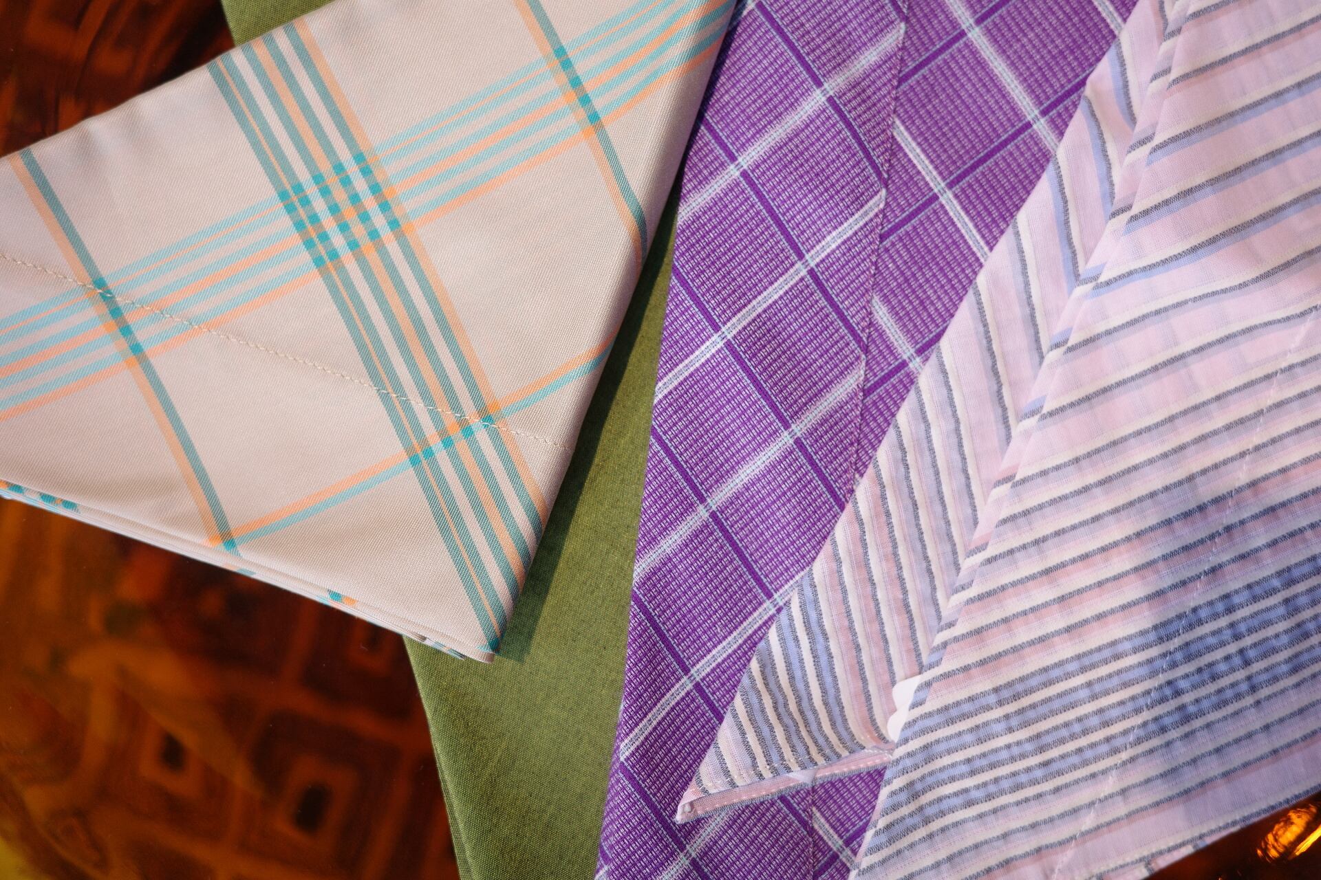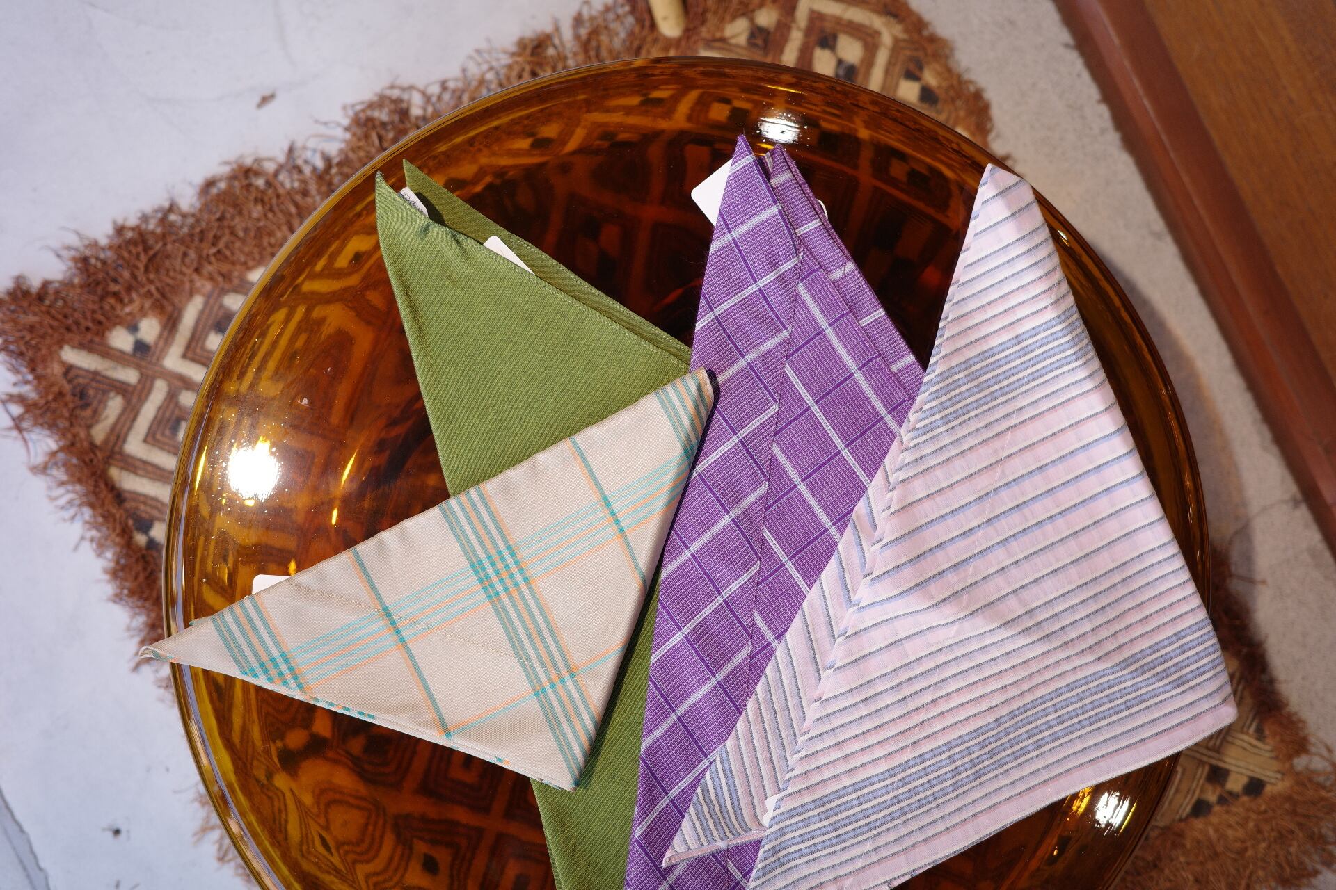 color/SAKURA(薄いピンクチェック柄)、MOSS(無地のグリーン)、SAND(ベージュチェック柄)、PANSY(purpleチェック柄) size/93cm×47cm 素材の質感を活かしたシンプルな三角スカーフ。頭に巻くだけでなく、首元のスカーフ、肩掛け、ベルトやエプロンとしてもアレンジ自在。 デッドストックのコットン混生地を使用し、他にはないノスタルジックなカラーリングがポイント。 しっかりと結ぶことができるため、さまざまなスタイリングが楽しめます。