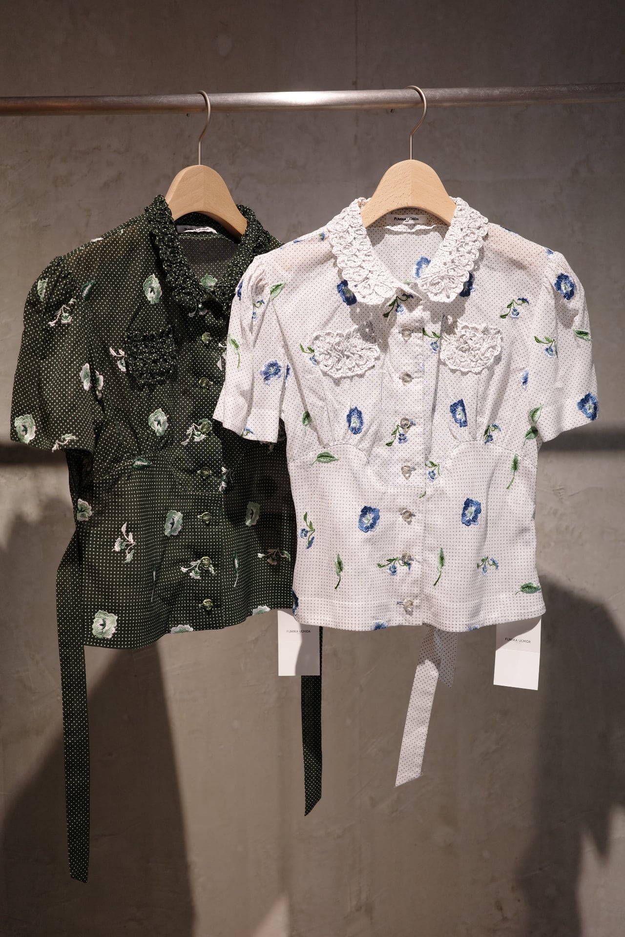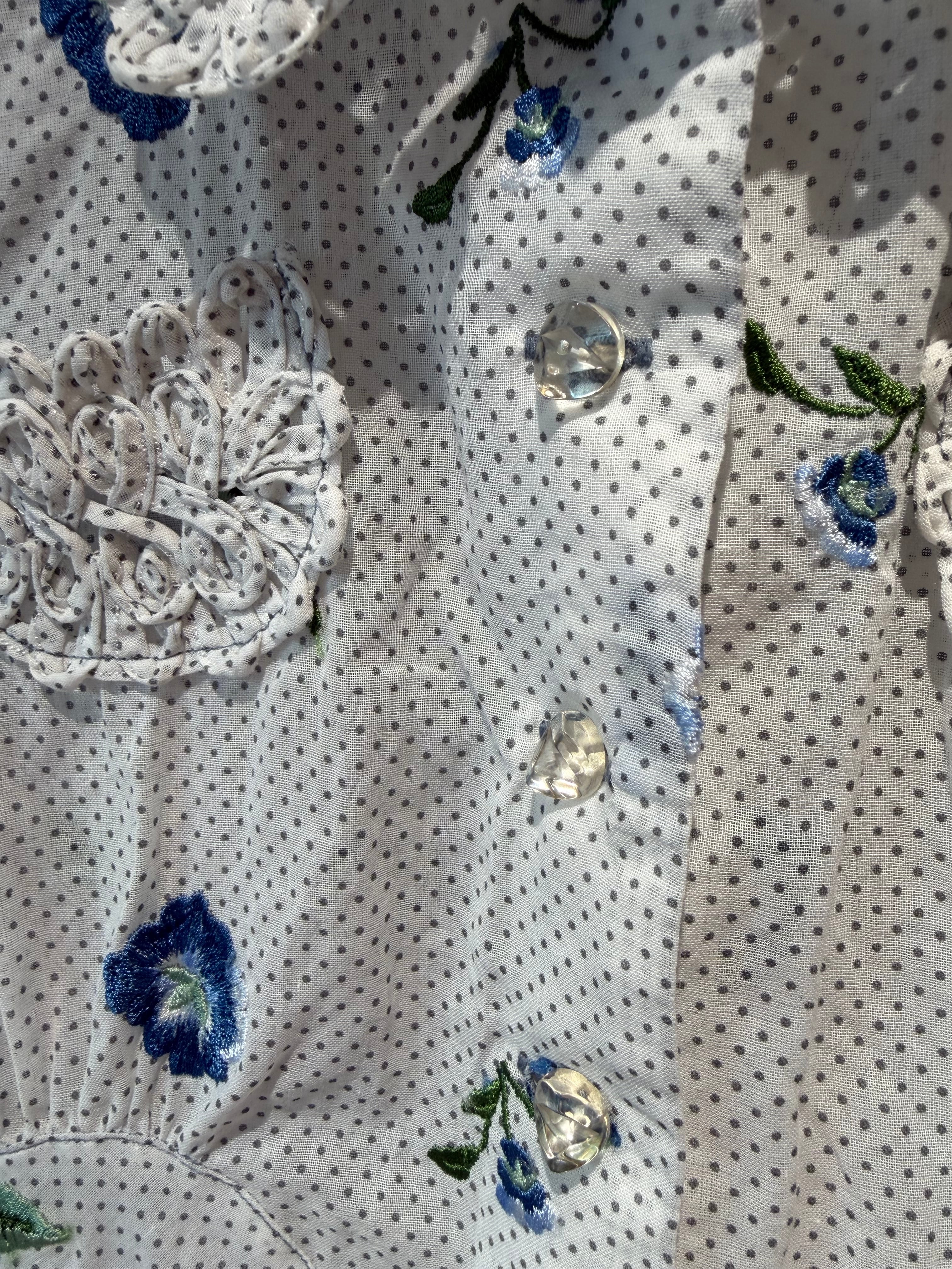 color/WHITE,BOTTLE GREEN Material/cotton 100% size/36 SIZE/着丈51.5 肩幅38.5 バスト98 ウエスト78 そでたけ21.5 ※採寸は多少の誤差がございます。あらかじめご了承くださいませ。 清涼感のあるコットンボイルにドットプリントと花柄の刺繍を組み合わせたシャツ。コード刺繍の襟とポケットがクラシカルなムードを引き立て、コンパクトなシルエットに自然な立体感を添えます。オリジナルのちょっとボタンも素敵です。